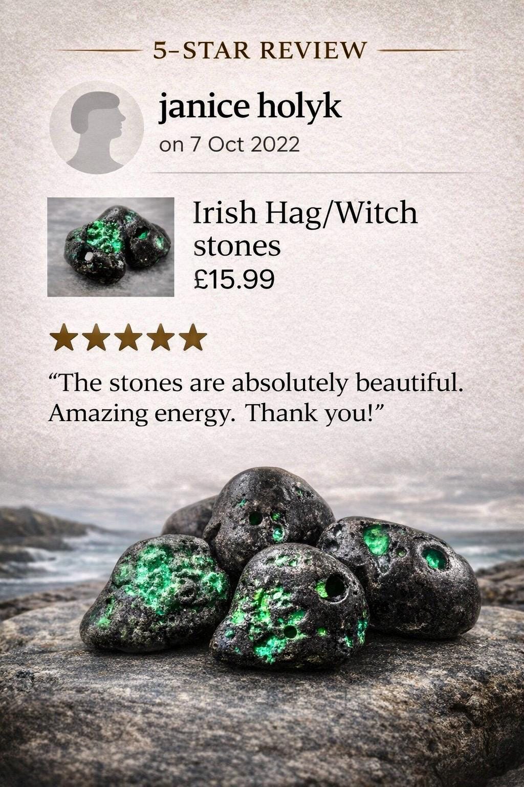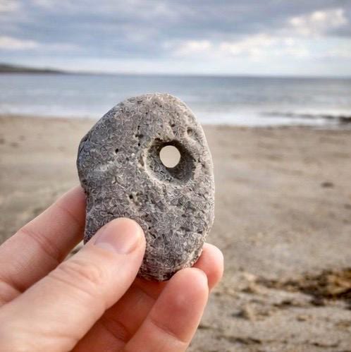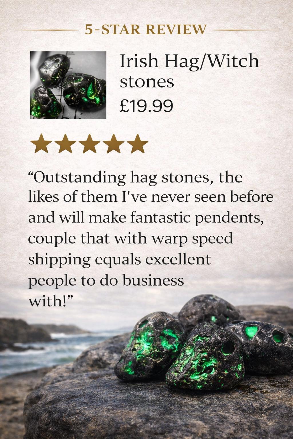 For centuries, naturally holed stones found on Irish beaches have been known as Hag Stones (also know as adder stones, fairy stones, witch stones or holey stones), by time, tide and relentless Irish currents, each one is completely unique — no two ever the same.