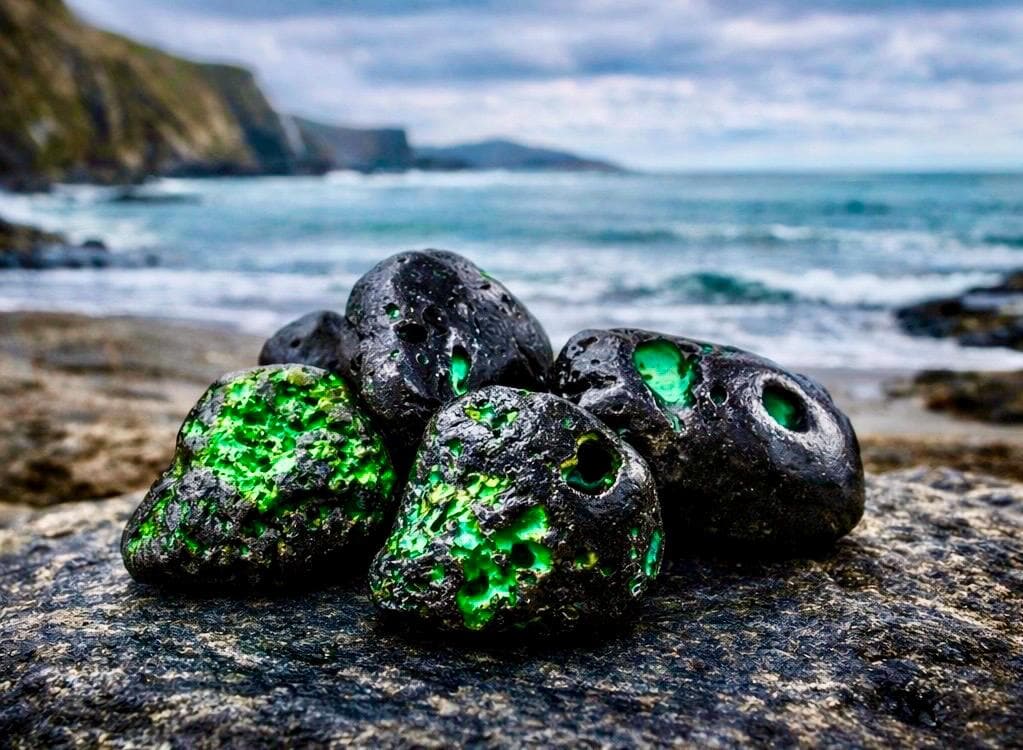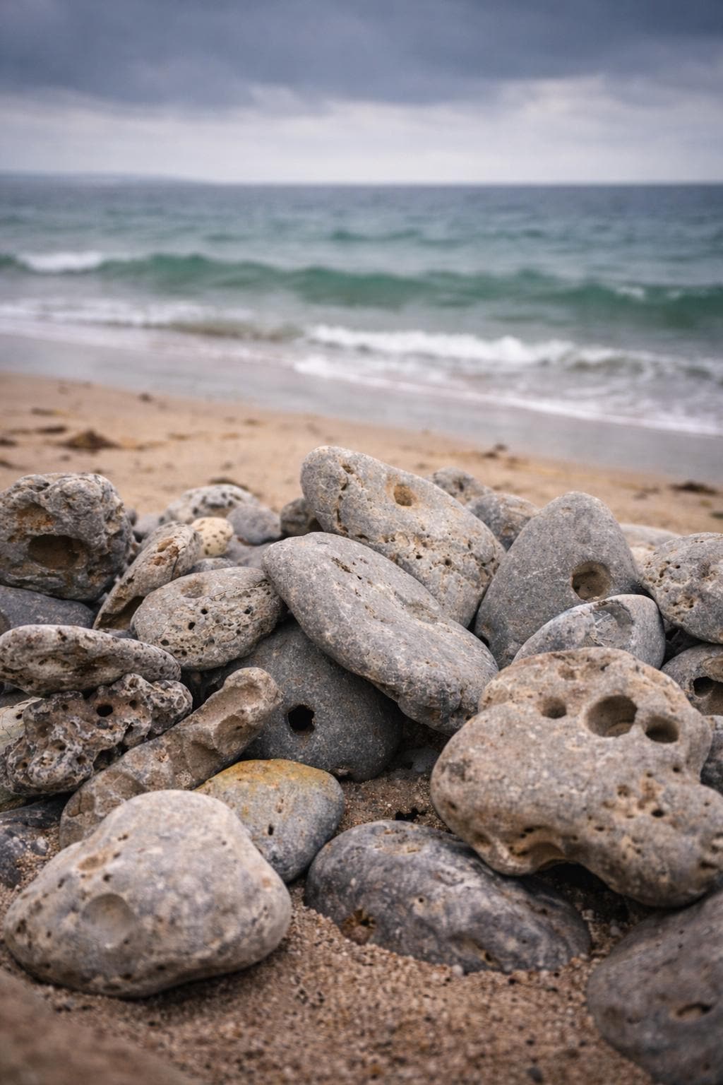 These stones have travelled further than we ever will — rolled by tide, weathered by storm, softened by sand.