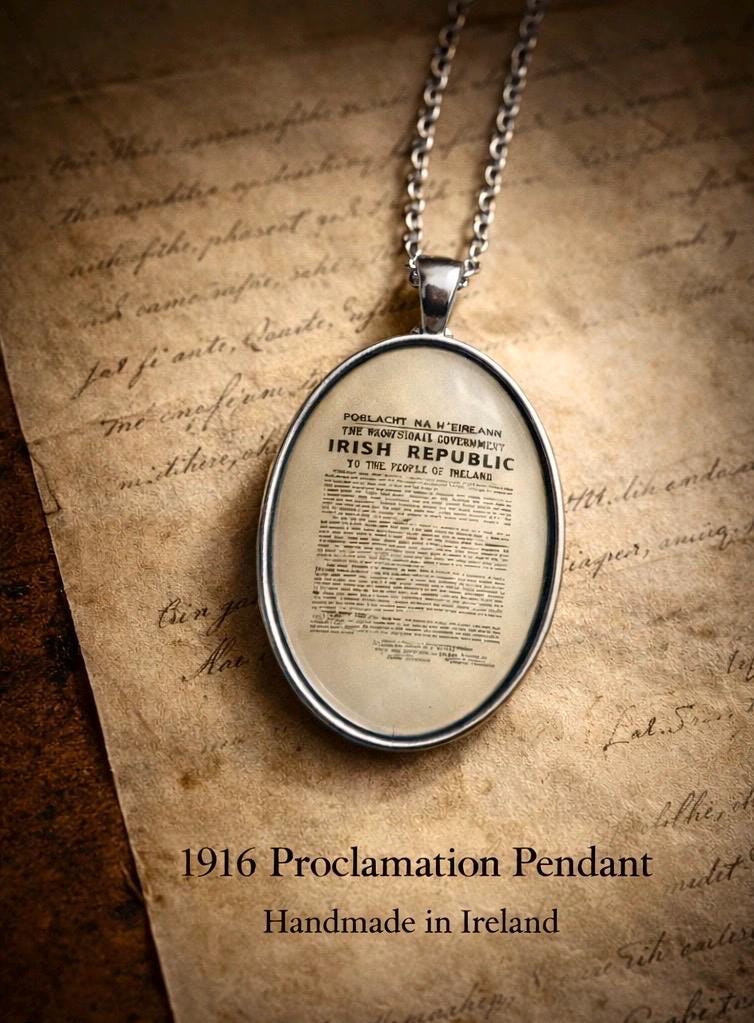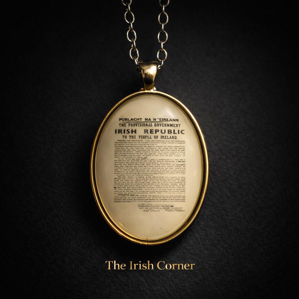 Each piece is completely handmade in Ireland and exclusive to The Irish Corner. At its heart lies a miniature of the Proclamation of the Irish Republic — carefully set and preserved beneath glass.