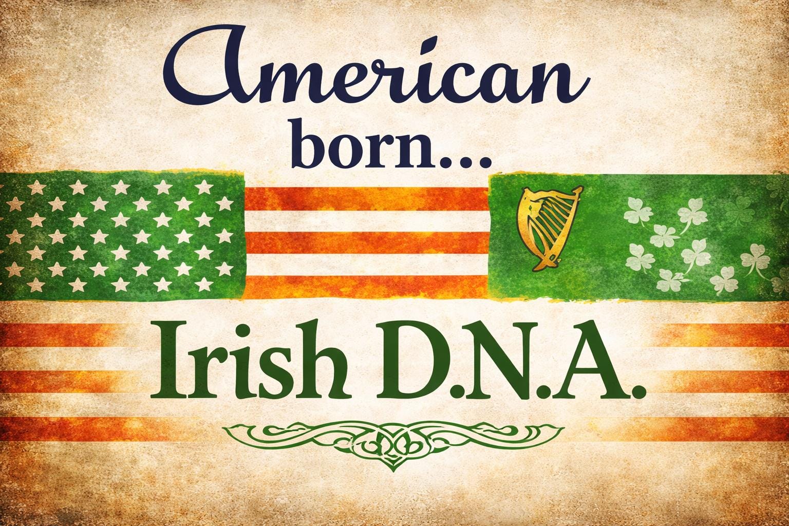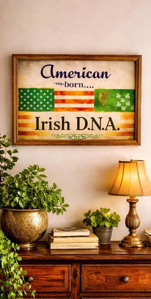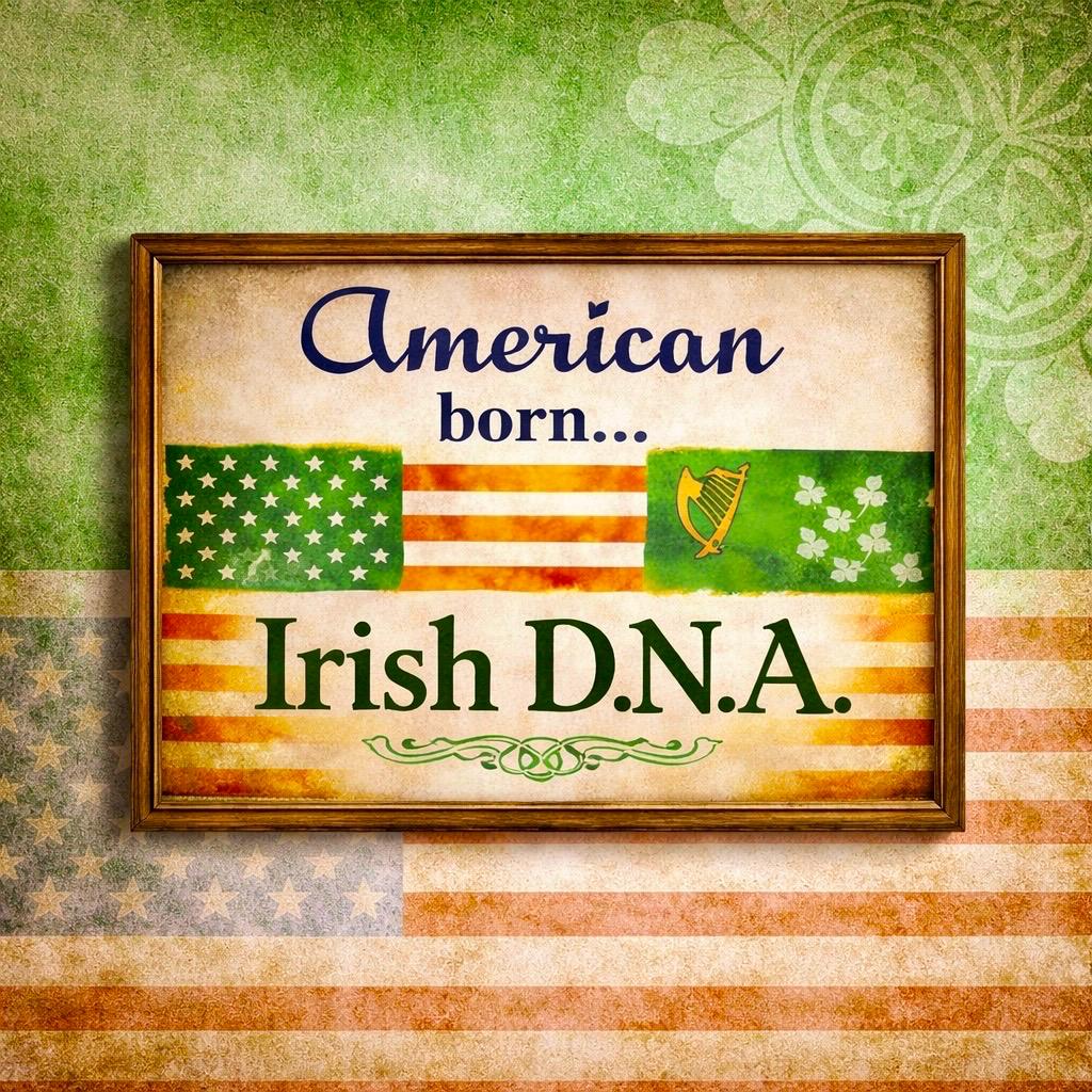 “American Born… Irish D.N.A.” captures the pride of two nations woven into one story. A bold tribute to Irish ancestry and American spirit, this piece blends heritage, resilience, and belonging into a design that speaks without shouting.