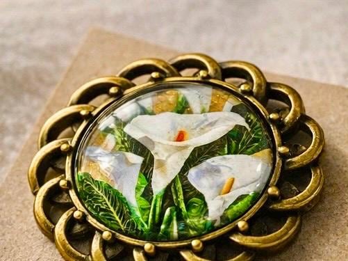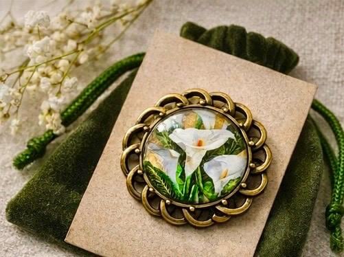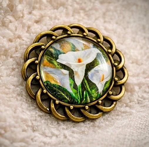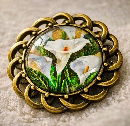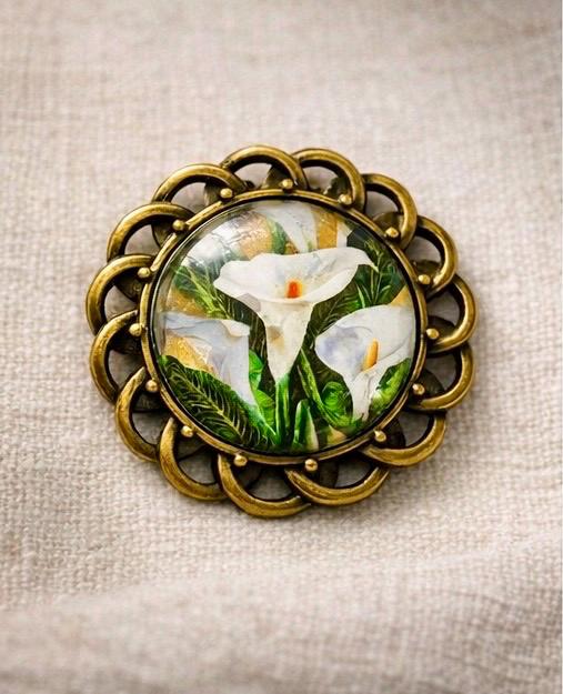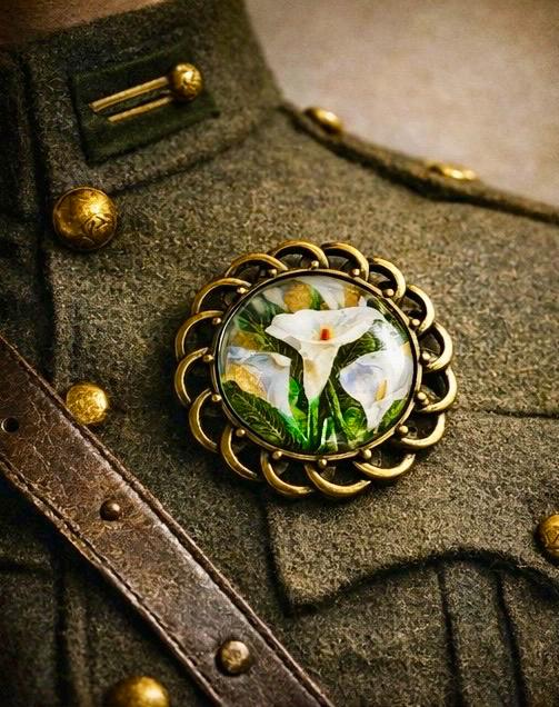 Featuring delicate white lilies set beneath a glass dome and framed in an antique-style setting, this piece carries both beauty and meaning. It is designed to be worn with pride — not just as jewellery, but as a symbol of memory, respect, and Irish identity.