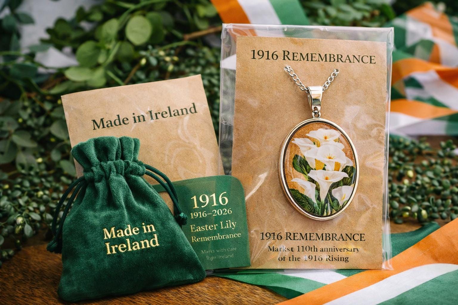 The Easter Lily symbol is commonly worn on rings, brooches, pendants and wristbands as a mark of remembrance for the heroes of 1916.