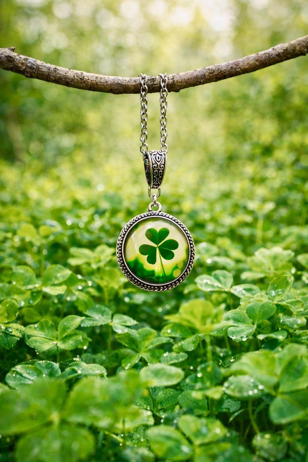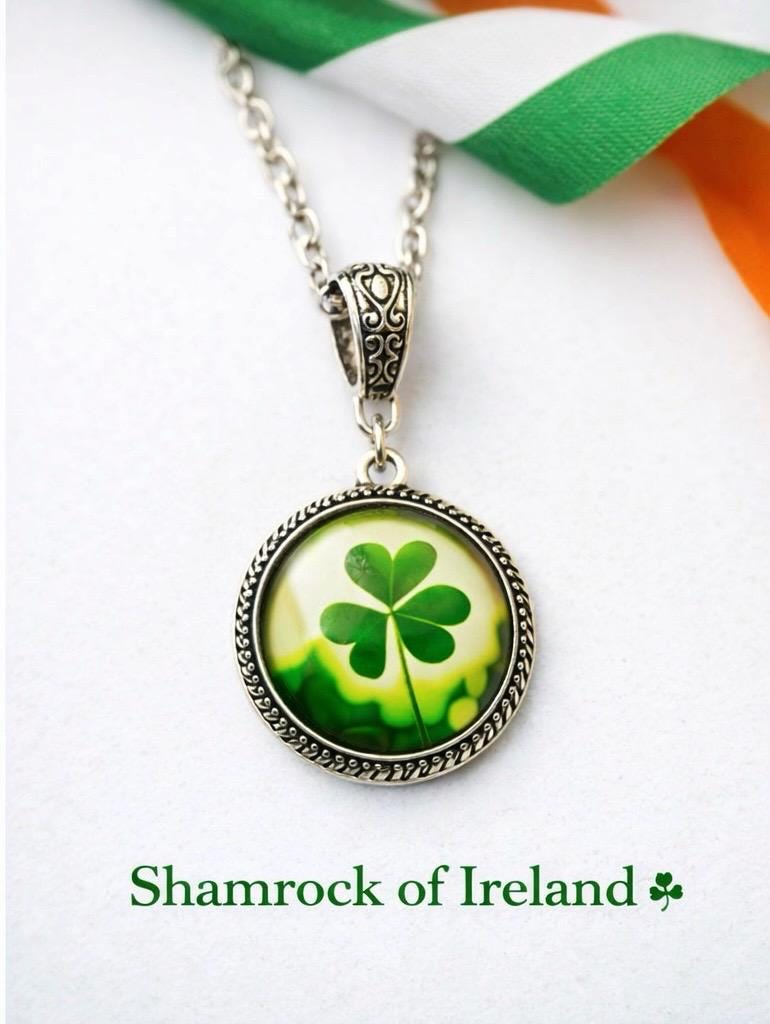 This 25mm shamrock pendant features a vibrant green design beneath a smooth resin dome, set in a silver bezel and suspended on a matching chain.