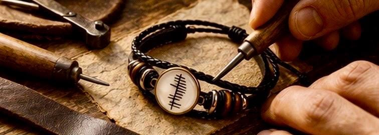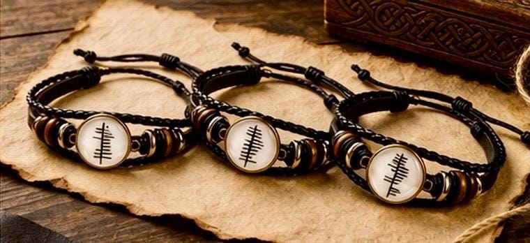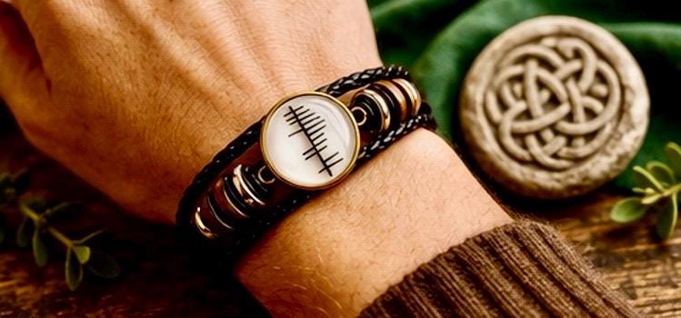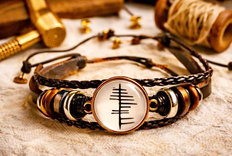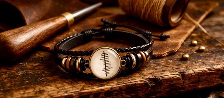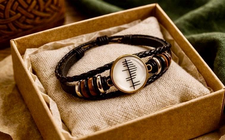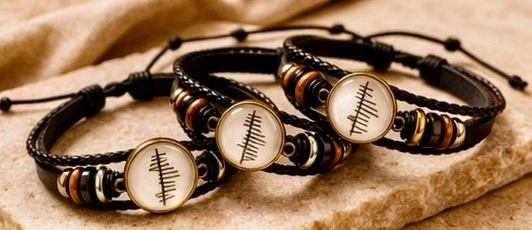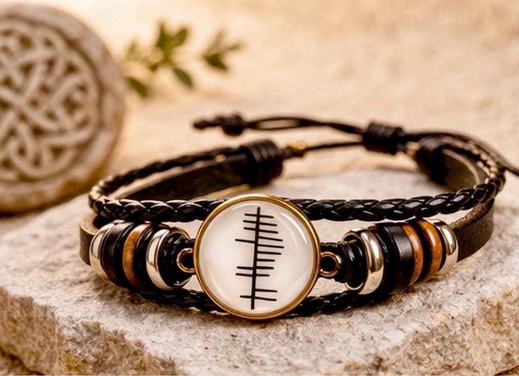 This personalised Ogham leather bracelet transforms your name, translated into Ancient Irish Ogham, Ireland’s oldest written language — carved in a style inspired by the markings once etched into stone across the Irish landscape.