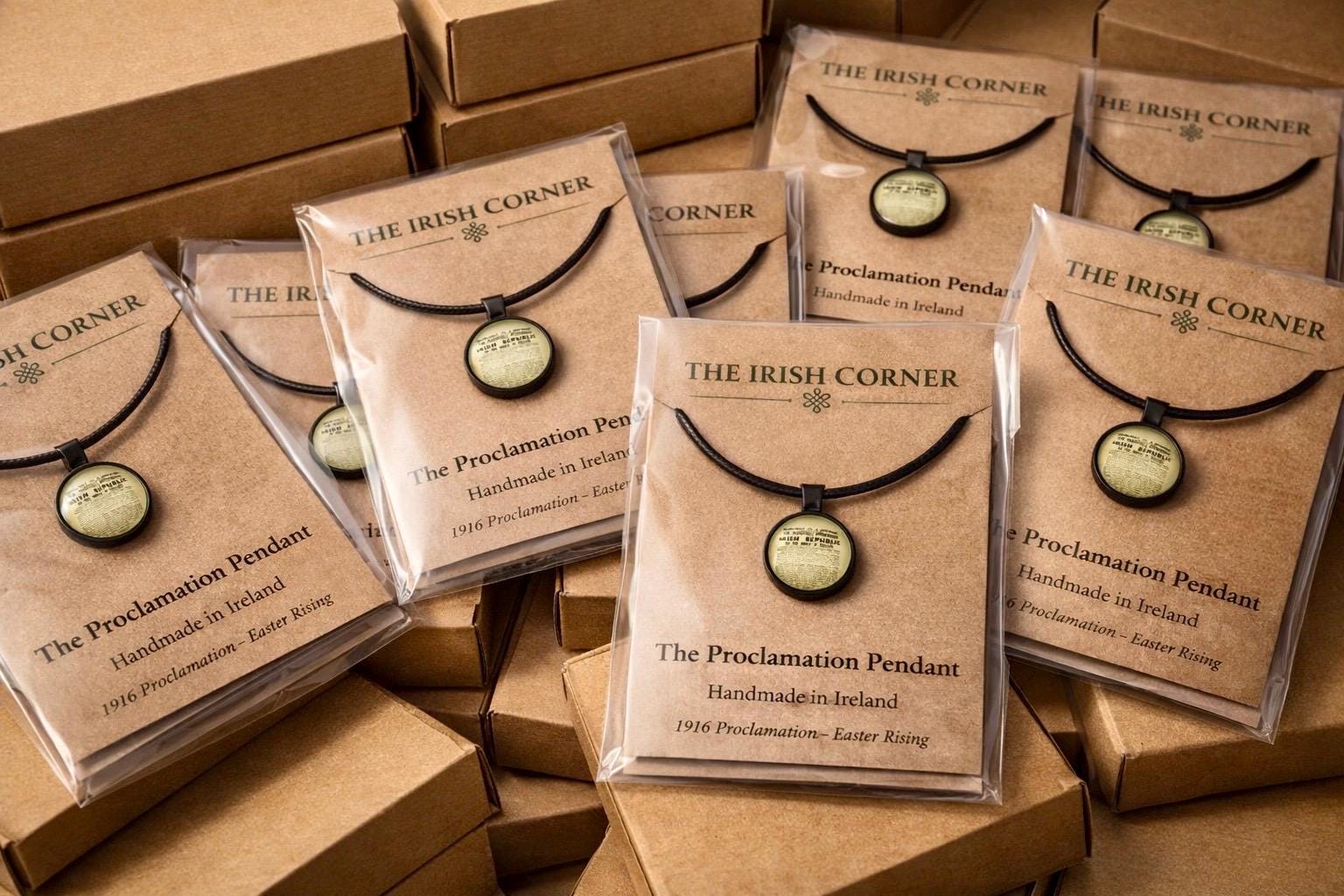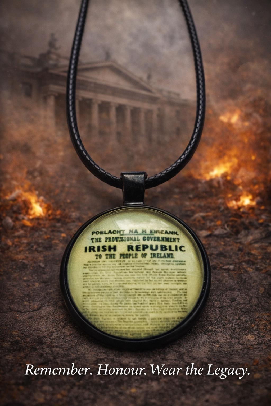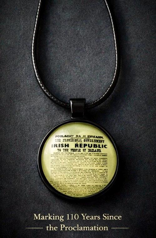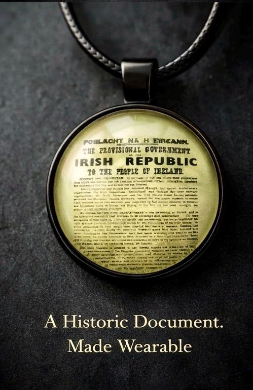 This handmade pendant carries a miniature reproduction of the Proclamation beneath glass — a quiet, wearable tribute to the document that changed Ireland forever.