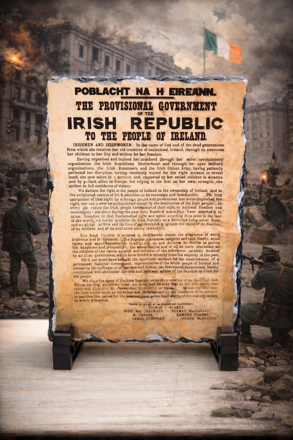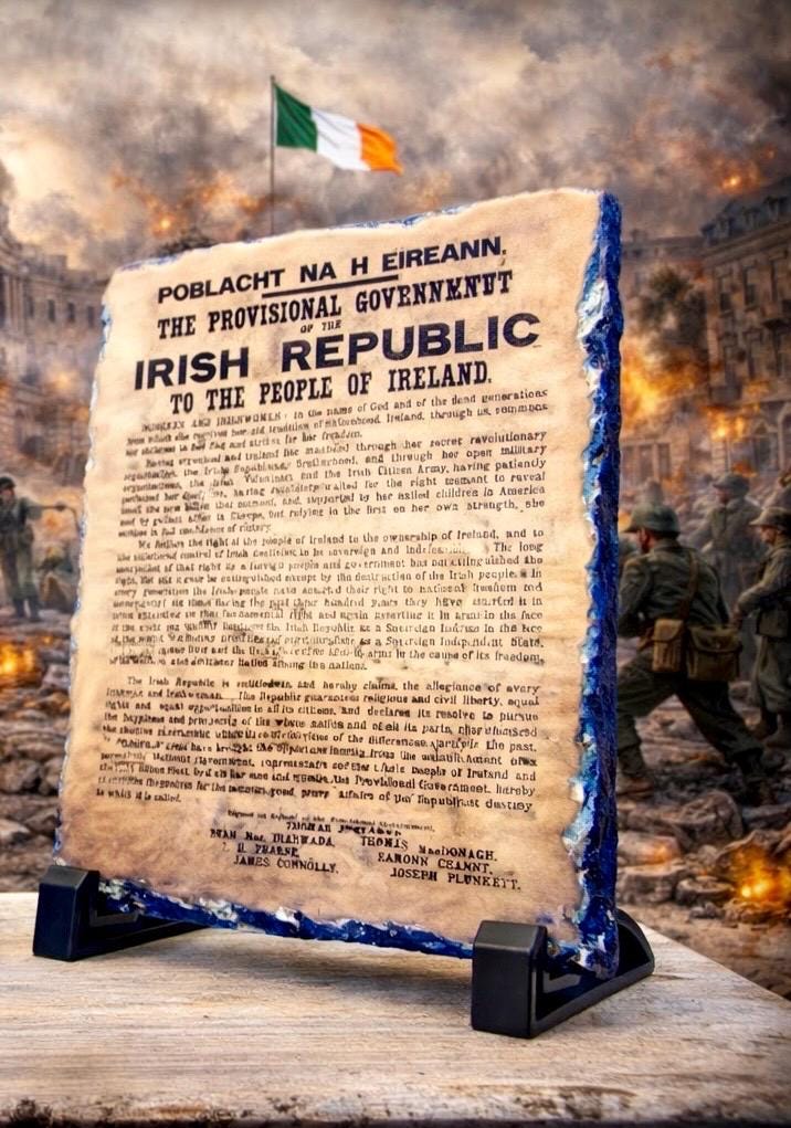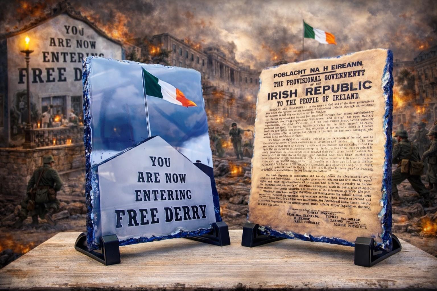 Now available for a limited time, this striking set features two iconic Irish images permanently fused onto genuine Irish slate — a natural stone long rooted in Ireland’s landscape and craft tradition. Each design is heat-bonded into the surface, creating a smooth, glass-like finish that enhances detail, depth, and durability.
