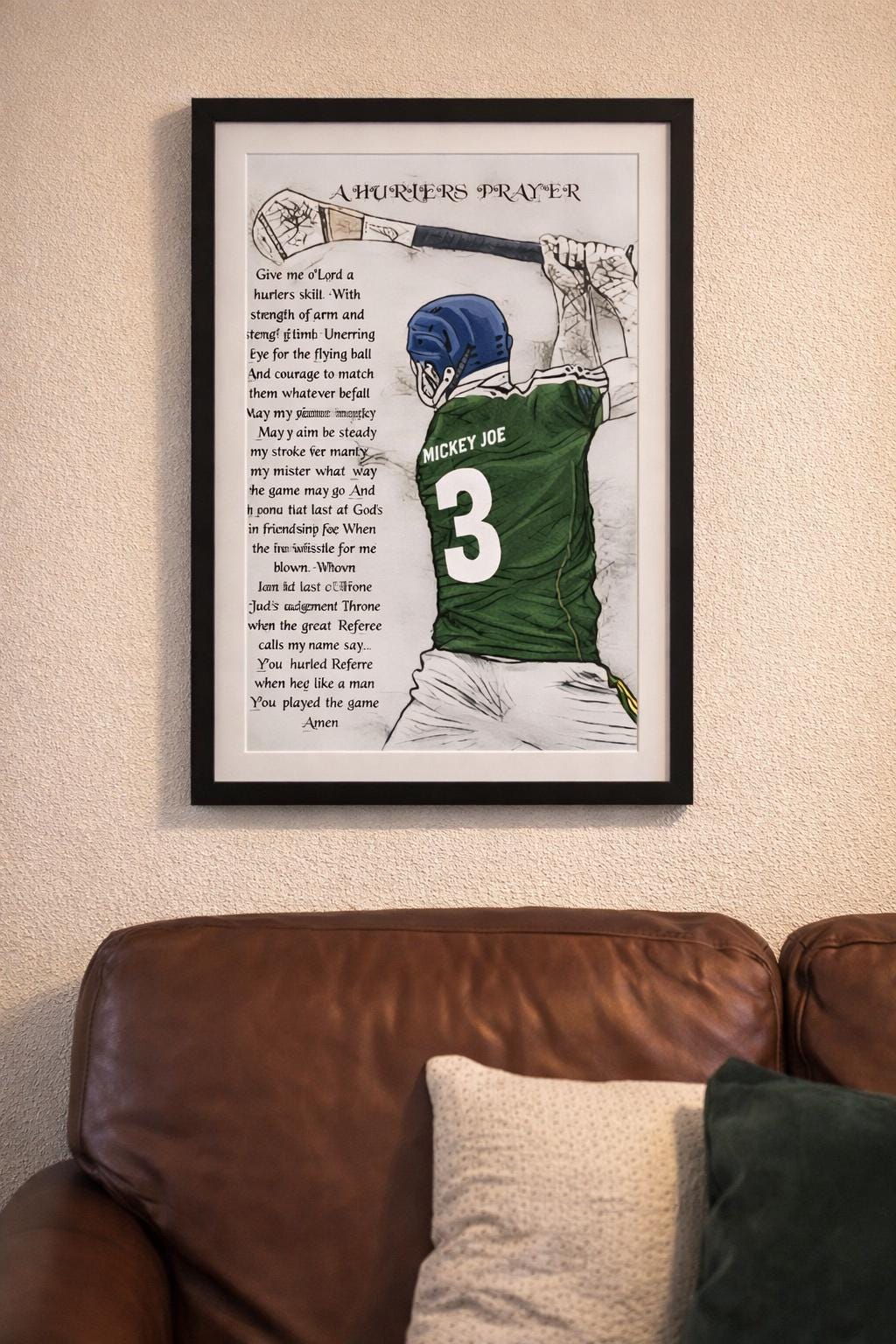 The prayer sits beside a striking player figure — a quiet reminder of dedication, sacrifice, teamwork and respect. Whether displayed in a family home, a player’s bedroom, a clubhouse or a pub wall, this piece carries meaning beyond the match.