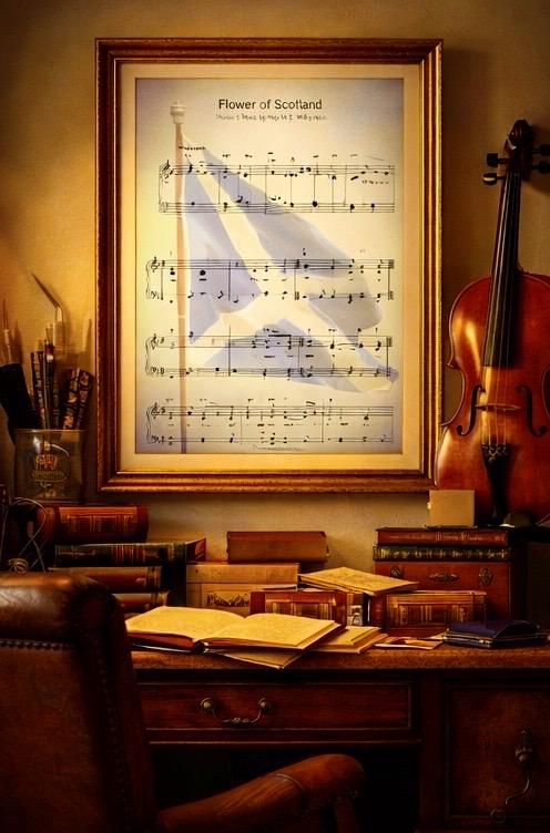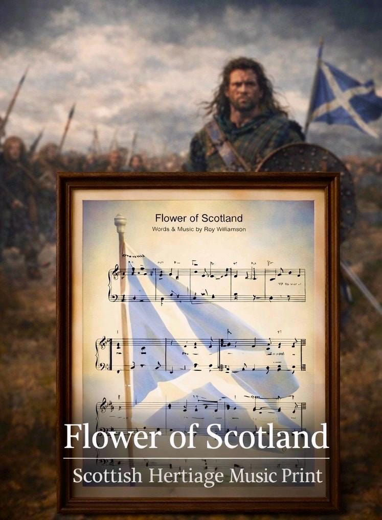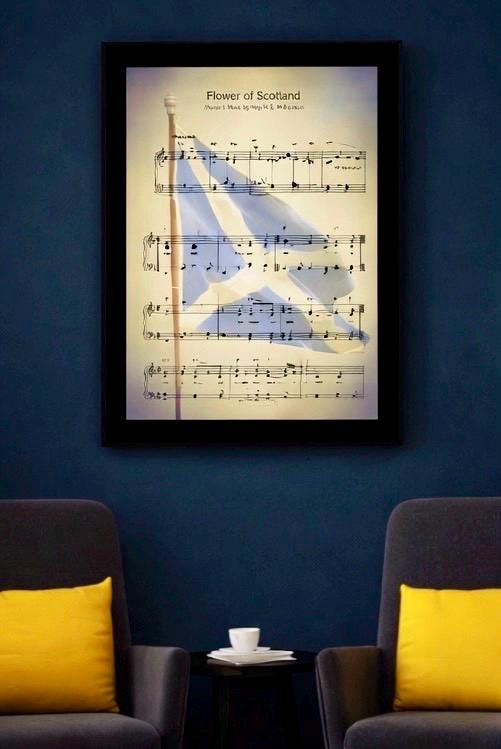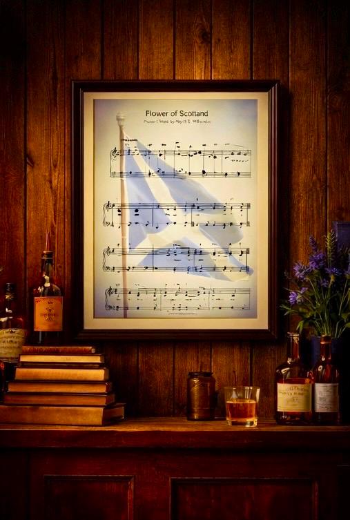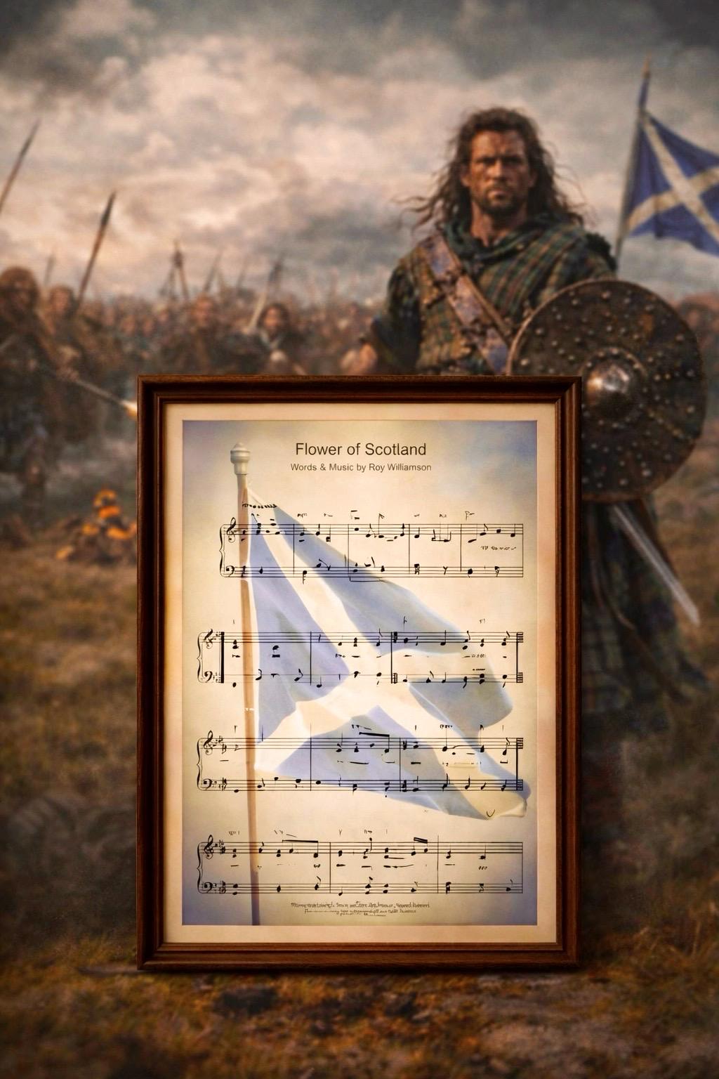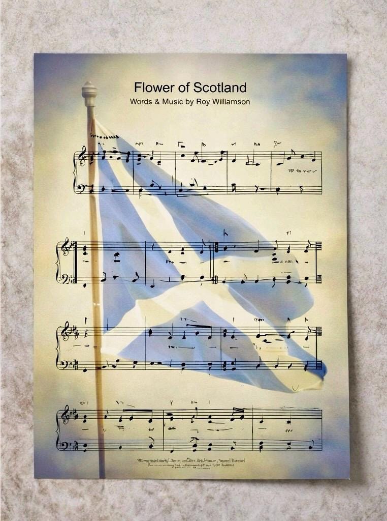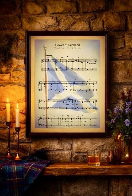 This high-resolution print blends the famous sheet music of the song with the Scottish Saltire, creating a meaningful piece of heritage wall art.