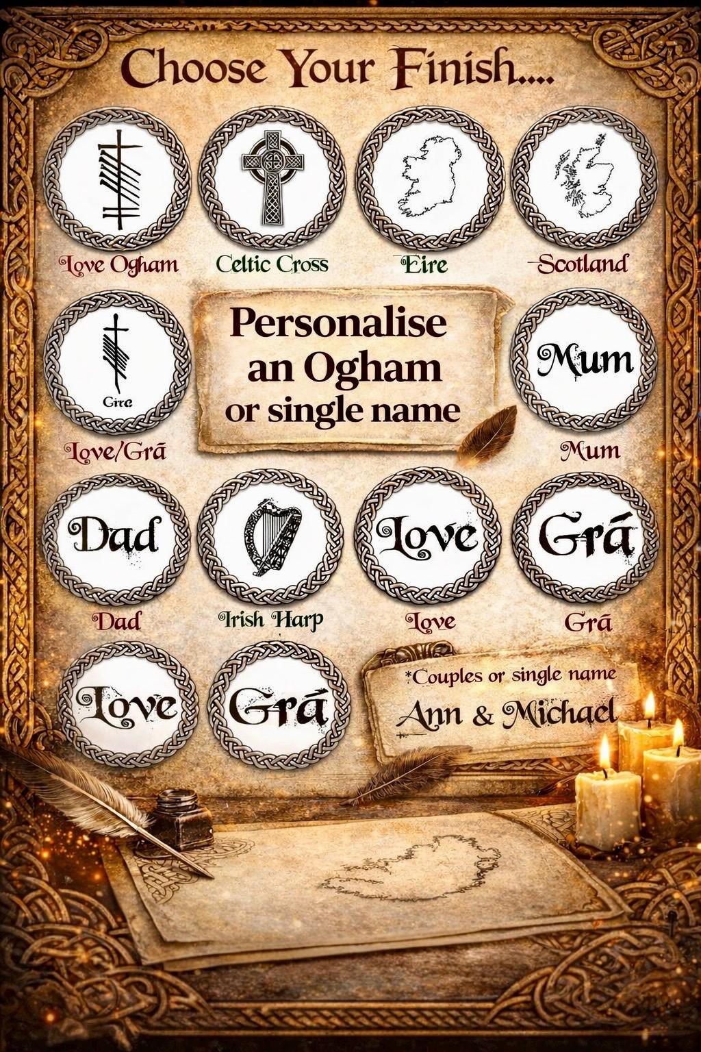 Simply choose from the list of finishes. Amazing addition to any outfit and a lovely way to stay connected to your Irish Roots. Simply let us know the pendant design finish you want or the ogham name or the single or couples names you desire.