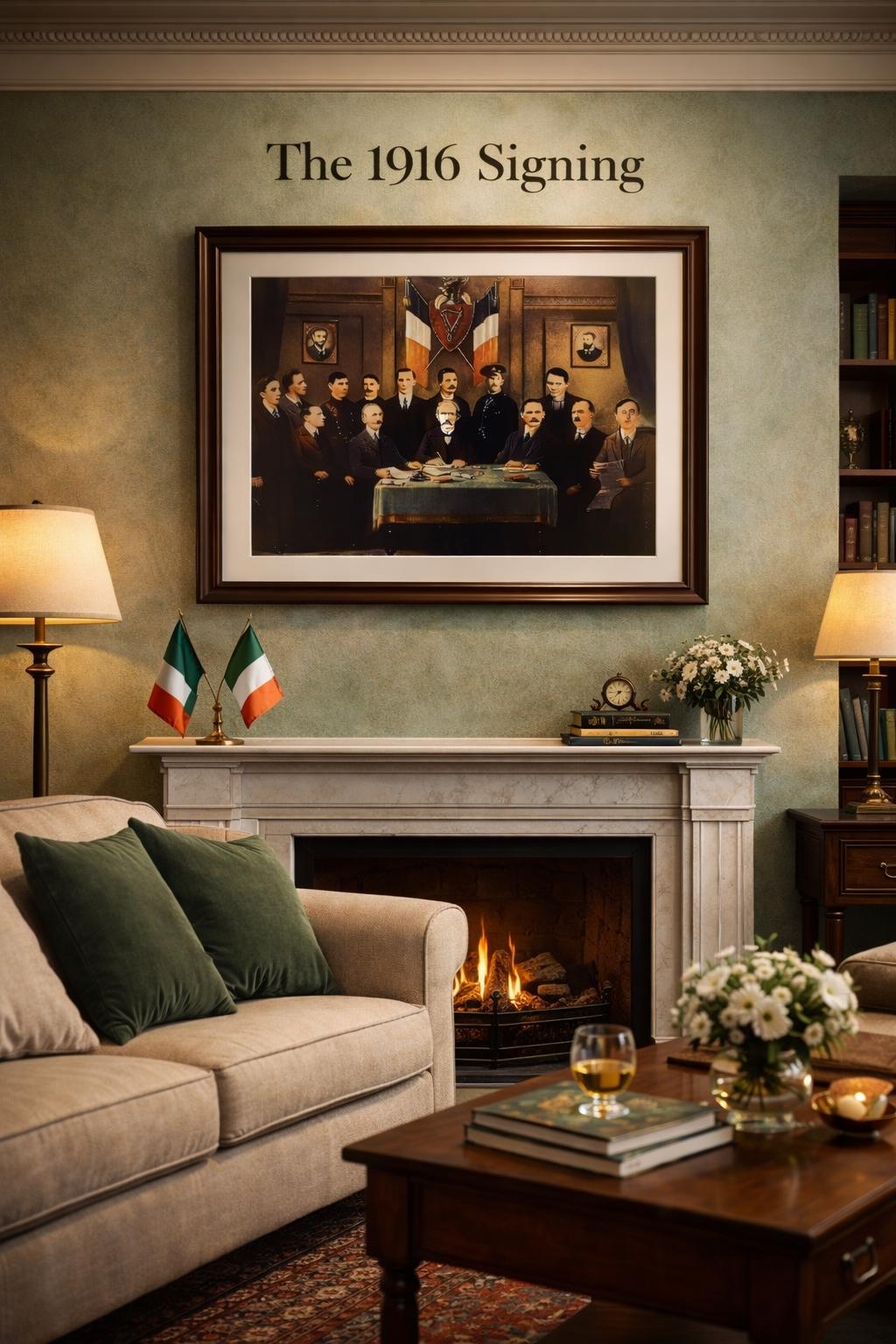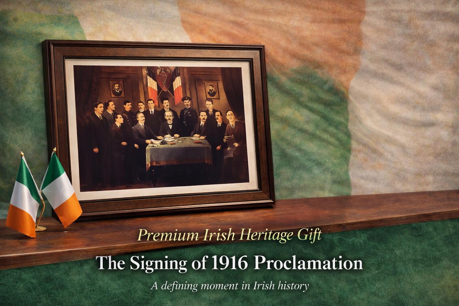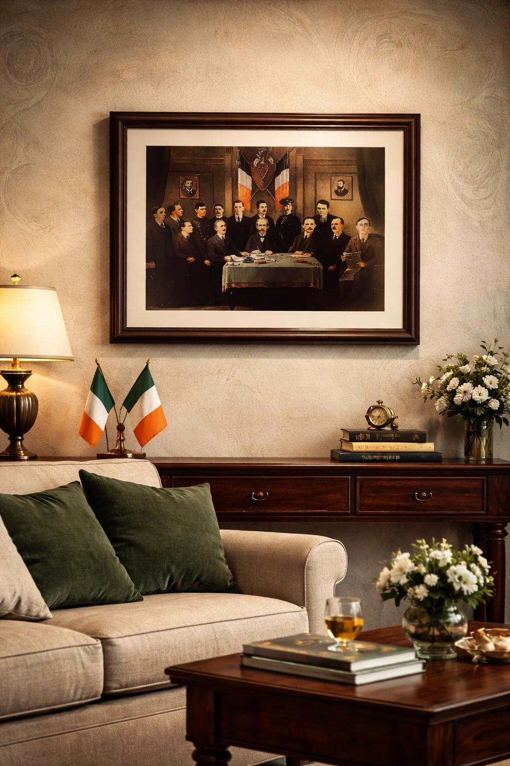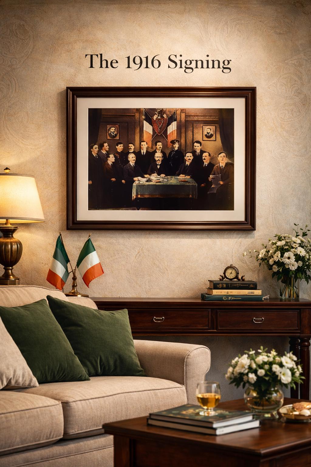 A striking framed display capturing “The 1916 Signing”, presented in a refined Irish-inspired setting. This piece honours a defining moment in Ireland’s story, blending heritage and elegance in one timeless image. Perfect for home or office, it offers a distinguished tribute that adds character, meaning, and conversation to any space.