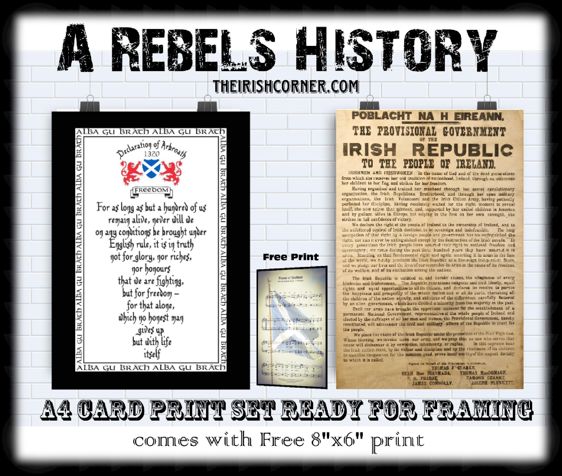 This A4 card set featuring a print by De Burca art depicts a patriotic theme with a portrait orientation, perfect for fans of Irish and Scottish history. The set includes a free print, making it a great value for those interested in adding a touch of Patriotic history to their décor. The unframed prints are ideal for showcasing in a home or office setting, adding a unique and artistic touch to any space. All 3 prints are unframed.