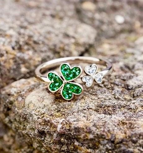 The Emerald Shamrock Ring is a striking tribute to Irish heritage — bold, luminous, and impossible to ignore. At its heart sits a dazzling three-leaf shamrock, bursting with rich emerald-green brilliance, framed in polished sterling silver for a finish that feels both luxurious and timeless.