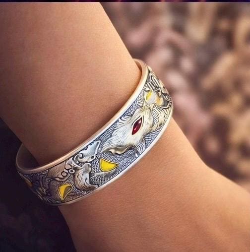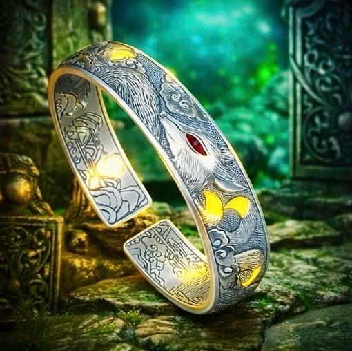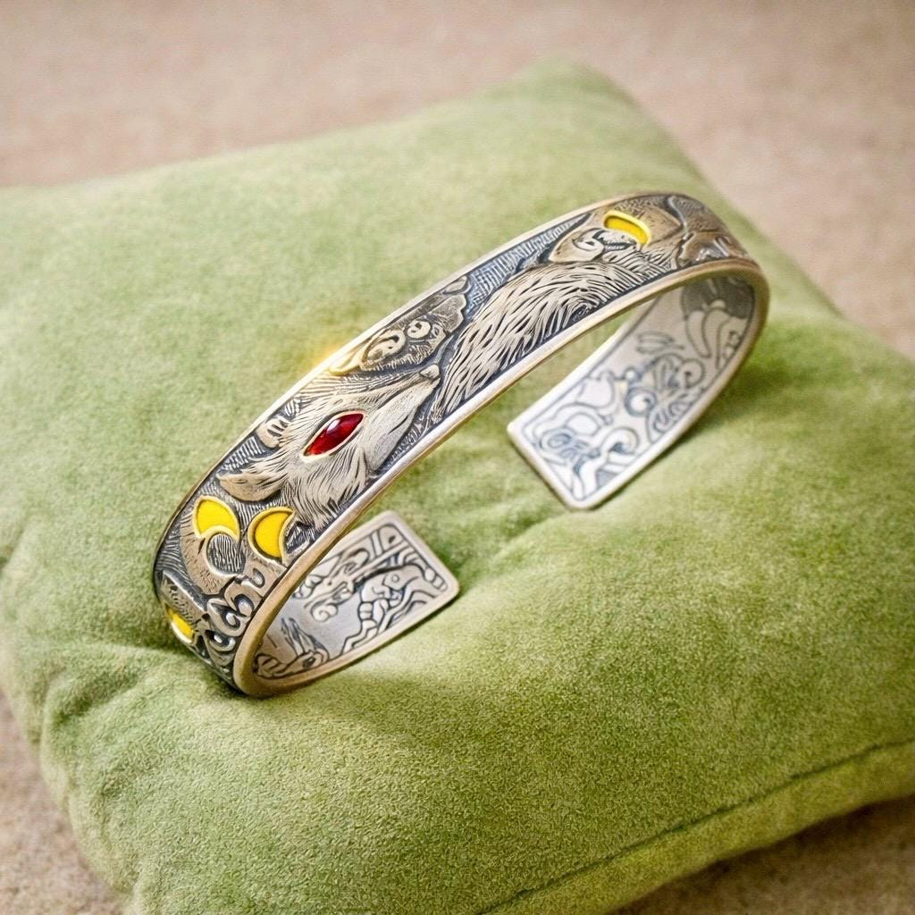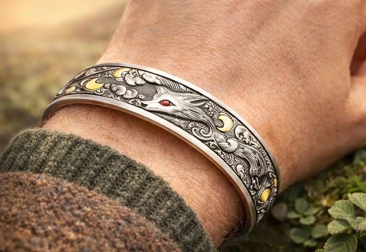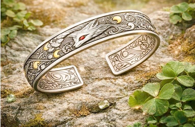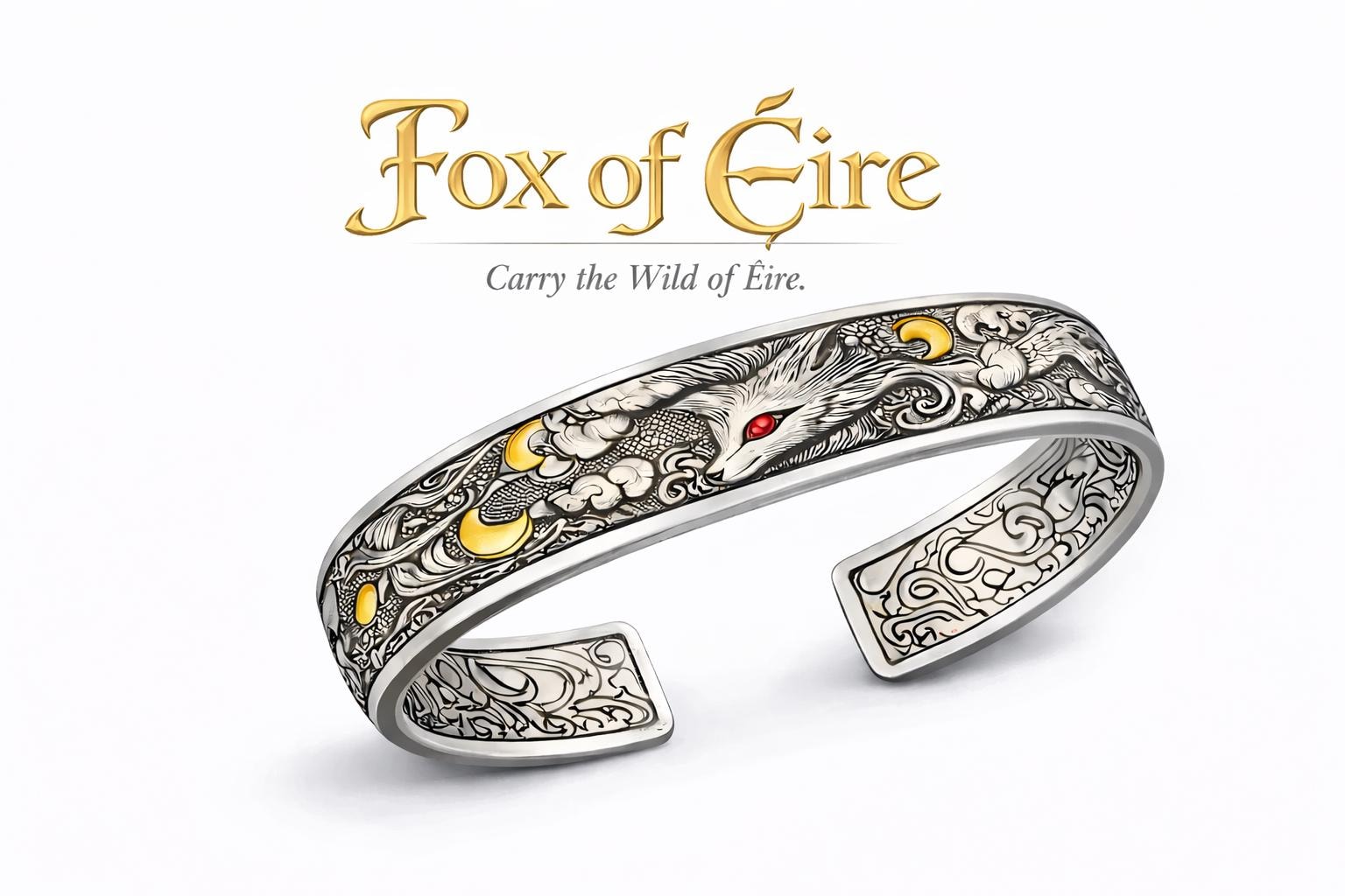 The Fox of Éire Sterling silver cuff captures that spirit in striking detail — a powerful engraved fox emerging through Celtic clouds and crescent moons, his red eye alive with fire and instinct.