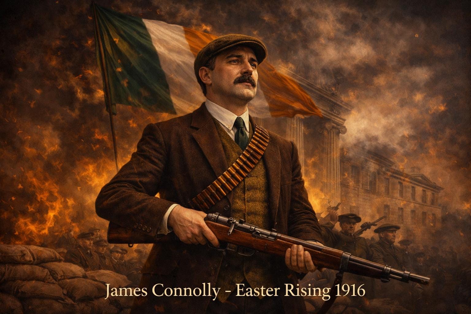 One of the most powerful figures of the 1916 Easter Rising, James Connolly stands here in defiance during the battle for Ireland’s future.