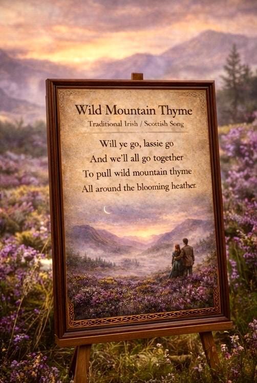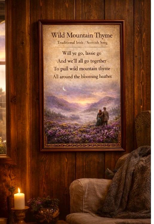Wild Mountain Thyme — also known as “Will Ye Go Lassie Go” — has been sung for generations in Irish homes, pubs, and gatherings around the world. The song evokes the spirit of Ireland’s wild landscapes and the deep emotional connection many people feel to the land.
