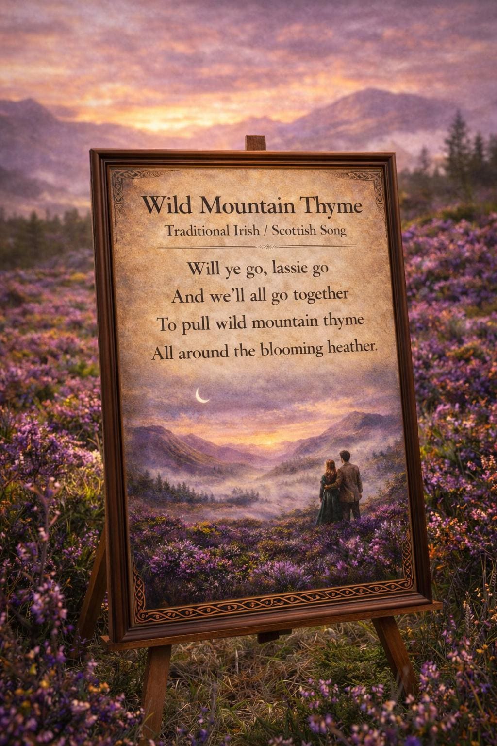 This artwork captures the romance and beauty of the Irish countryside, pairing the song’s timeless lyrics with a peaceful mountain landscape and blooming heather fields.