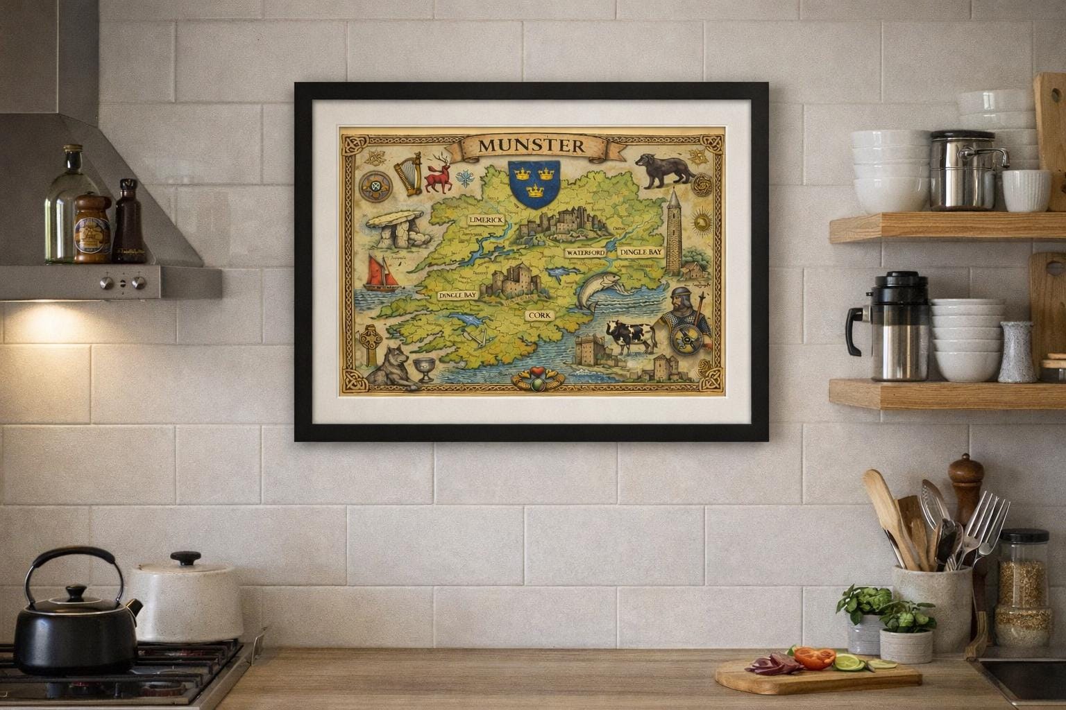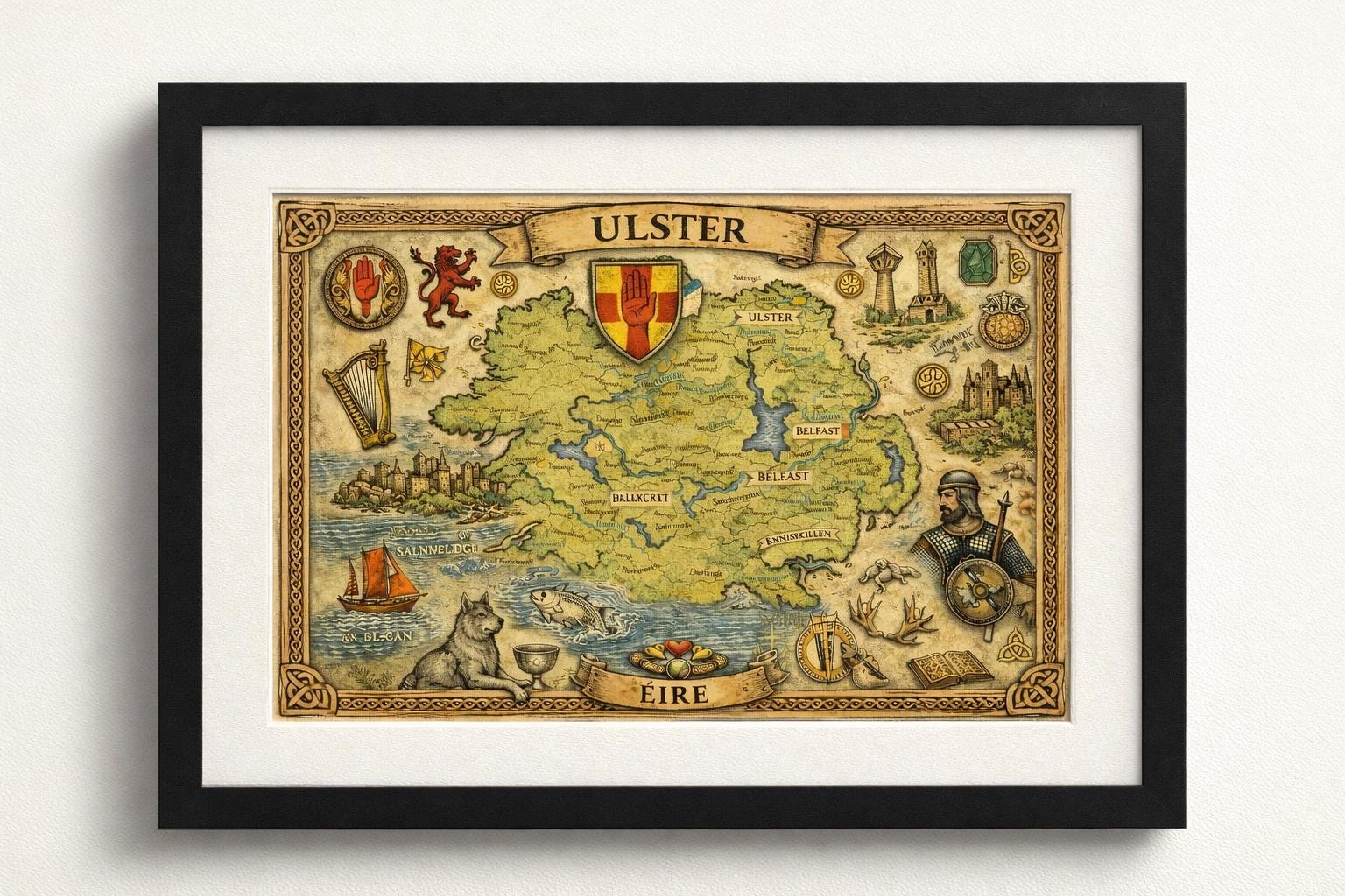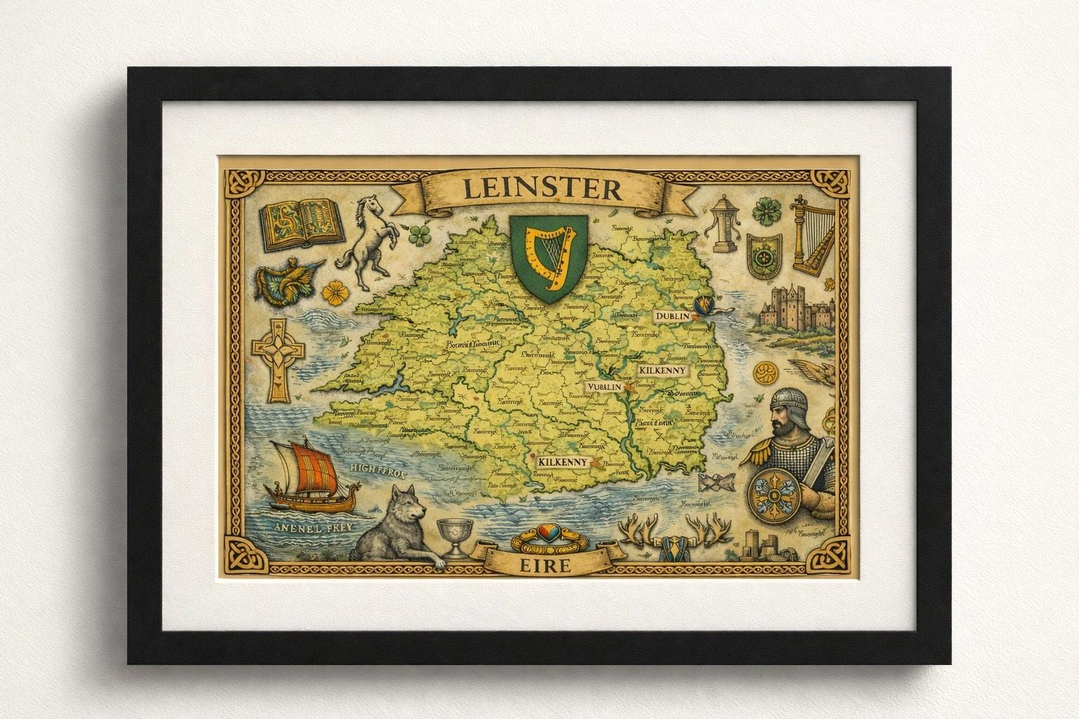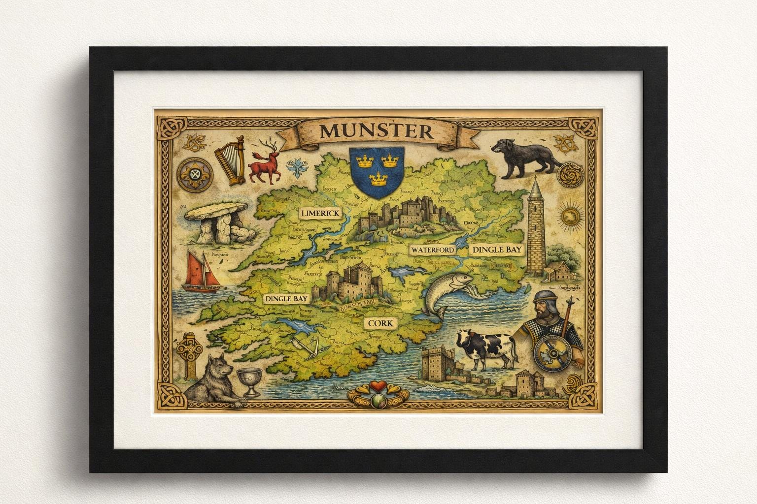 Each print highlights one of Ireland’s historic provinces with detailed maps, Celtic symbols, folklore imagery and traditional Irish elements. Together they form a striking set of artworks that capture the spirit and heritage of Ireland.