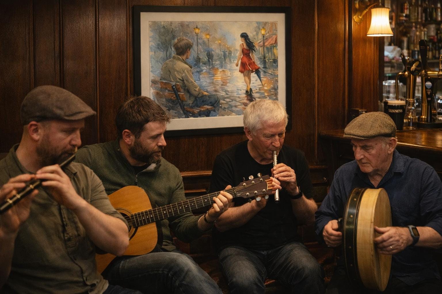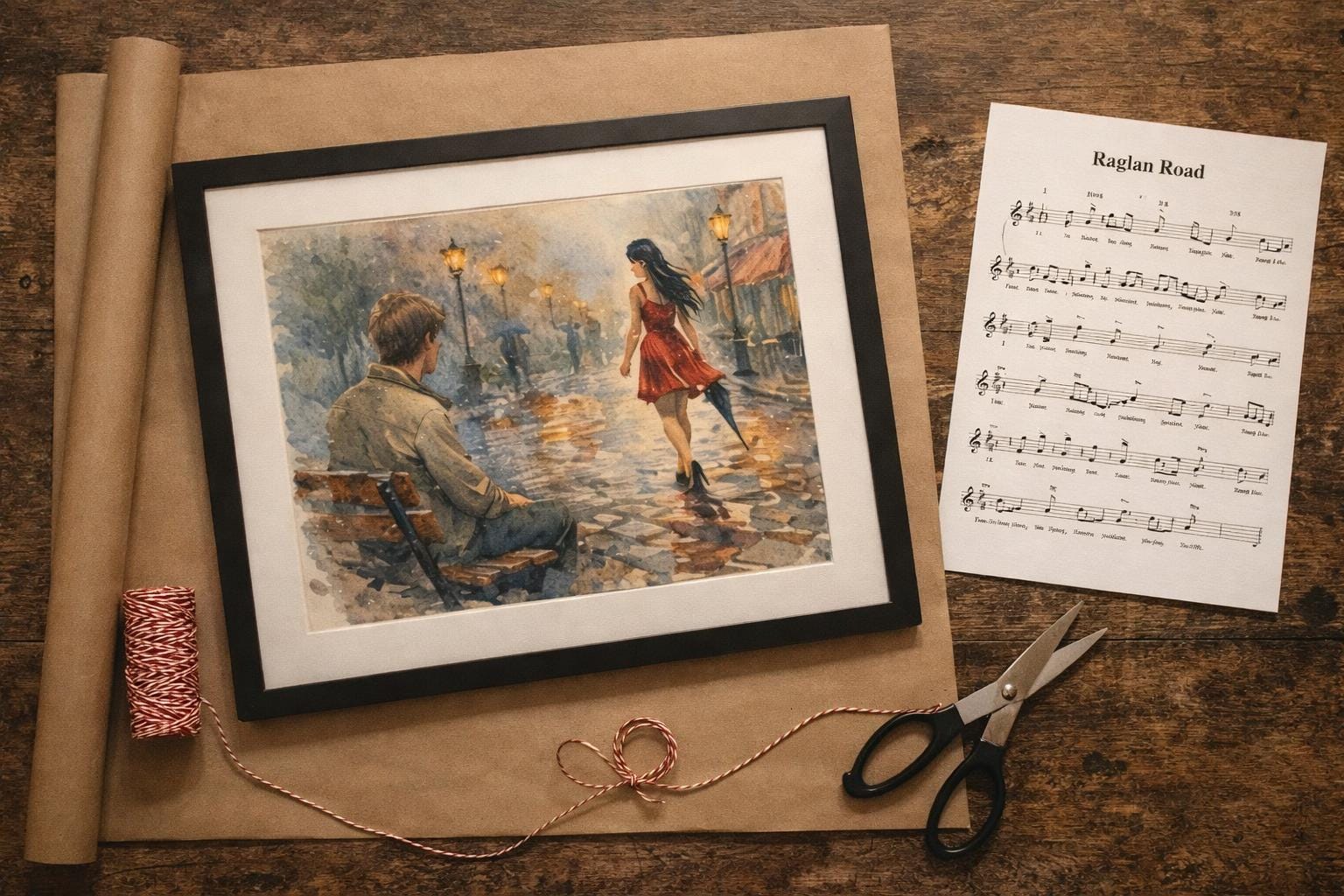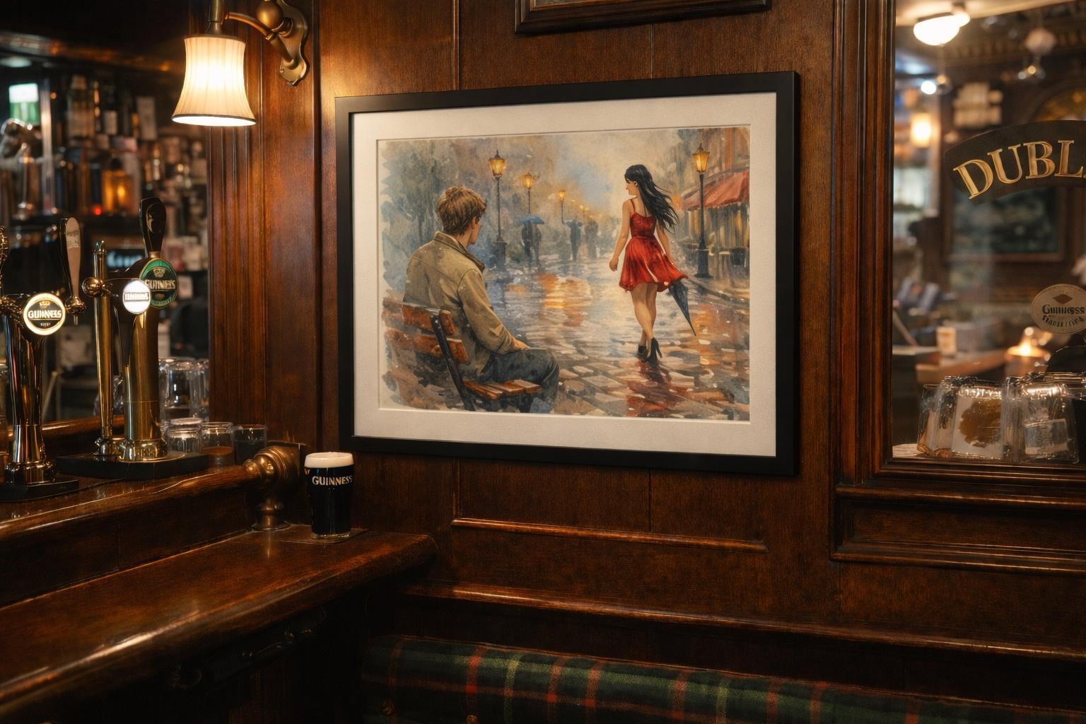 This artwork blends watercolour painting with modern digital artistry, creating a soft cinematic look reminiscent of classic European street scenes and romantic film moments. The glowing lamps, rain reflections and striking red dress make the image a beautiful focal point in any room.