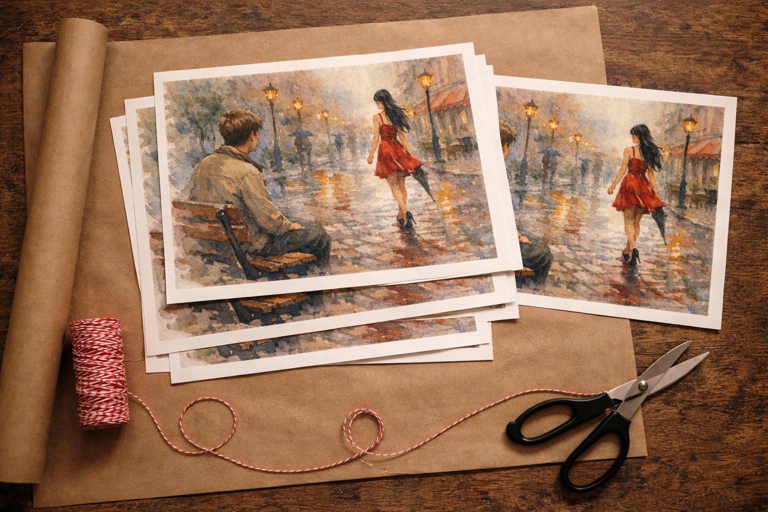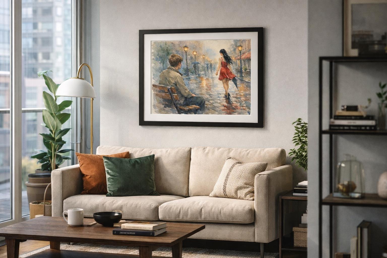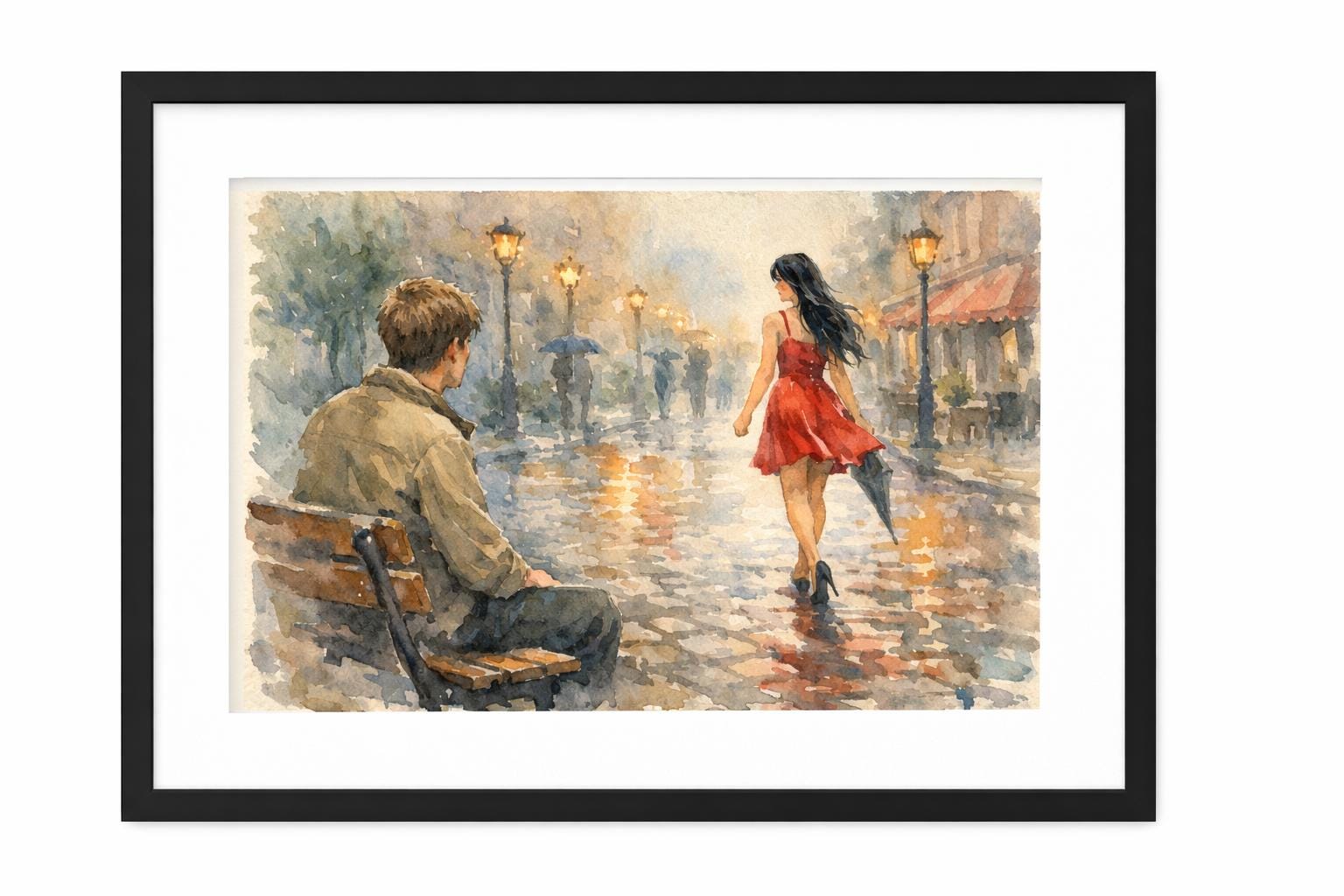 Bring a touch of romance and nostalgia to your home with this atmospheric watercolour-style art print. This evocative scene captures a quiet rainy evening where a young man watches a woman in a flowing red dress walk away beneath glowing street lamps. The reflections on the wet cobblestones and soft evening light create a cinematic moment that feels both timeless and emotional.