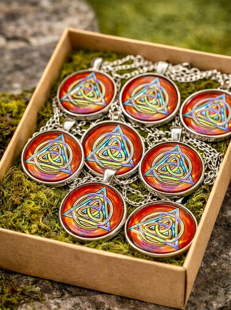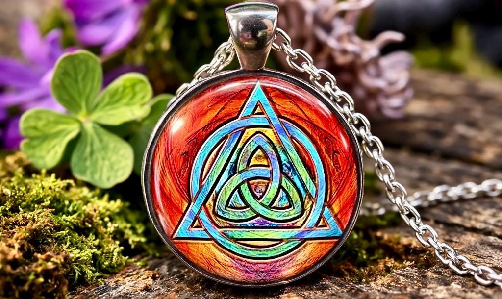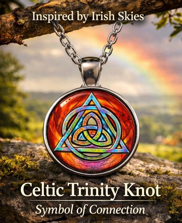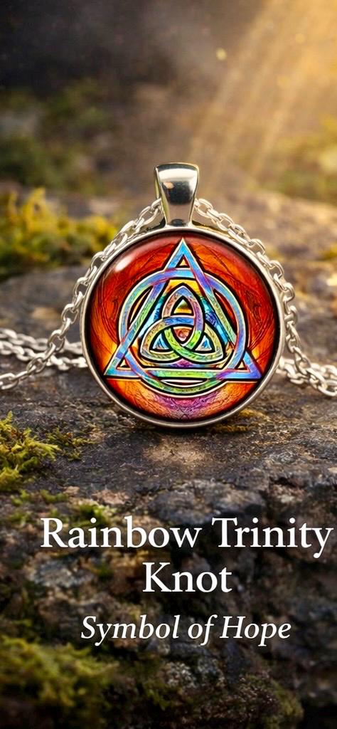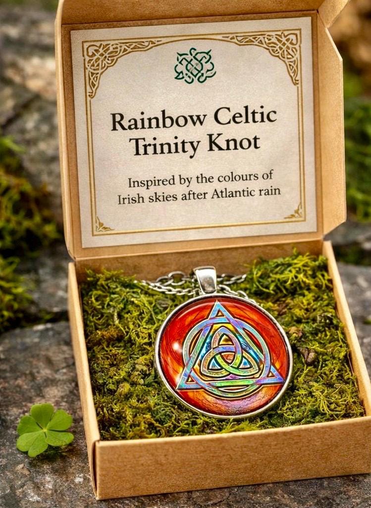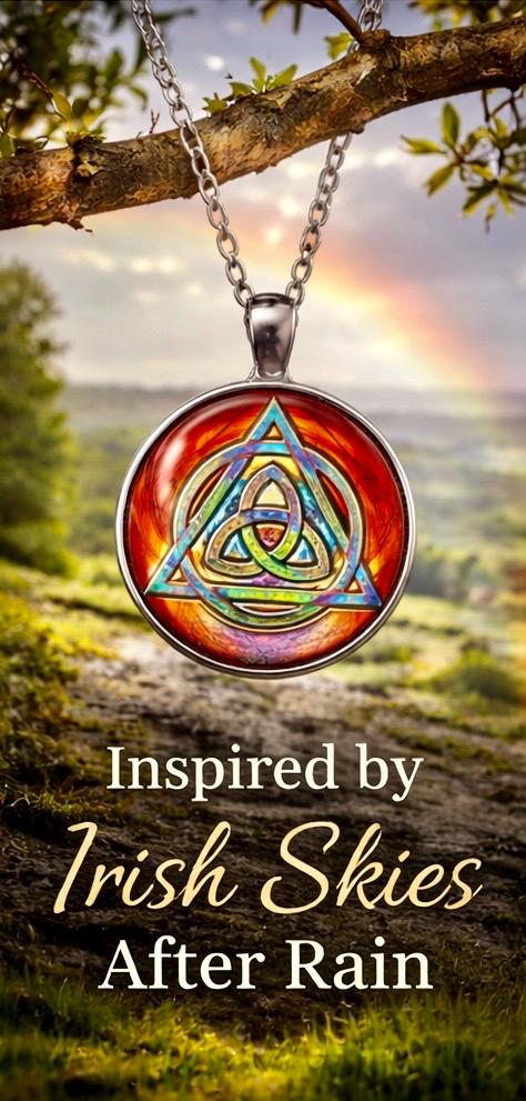 Inspired by the colours of Irish skies after Atlantic rain, this Rainbow Trinity Knot pendant carries a quiet reminder that brighter days always follow.