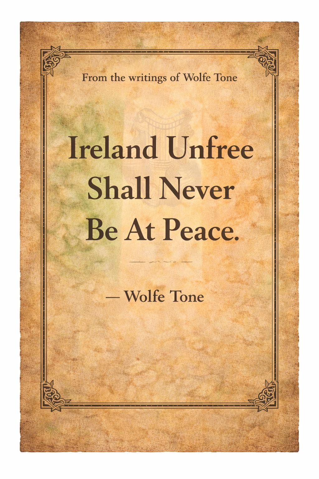 Set against a warm aged background with subtle Celtic detailing, the design evokes the feeling of an old proclamation — something that could have been pinned to a wall during Ireland’s struggle for independence.