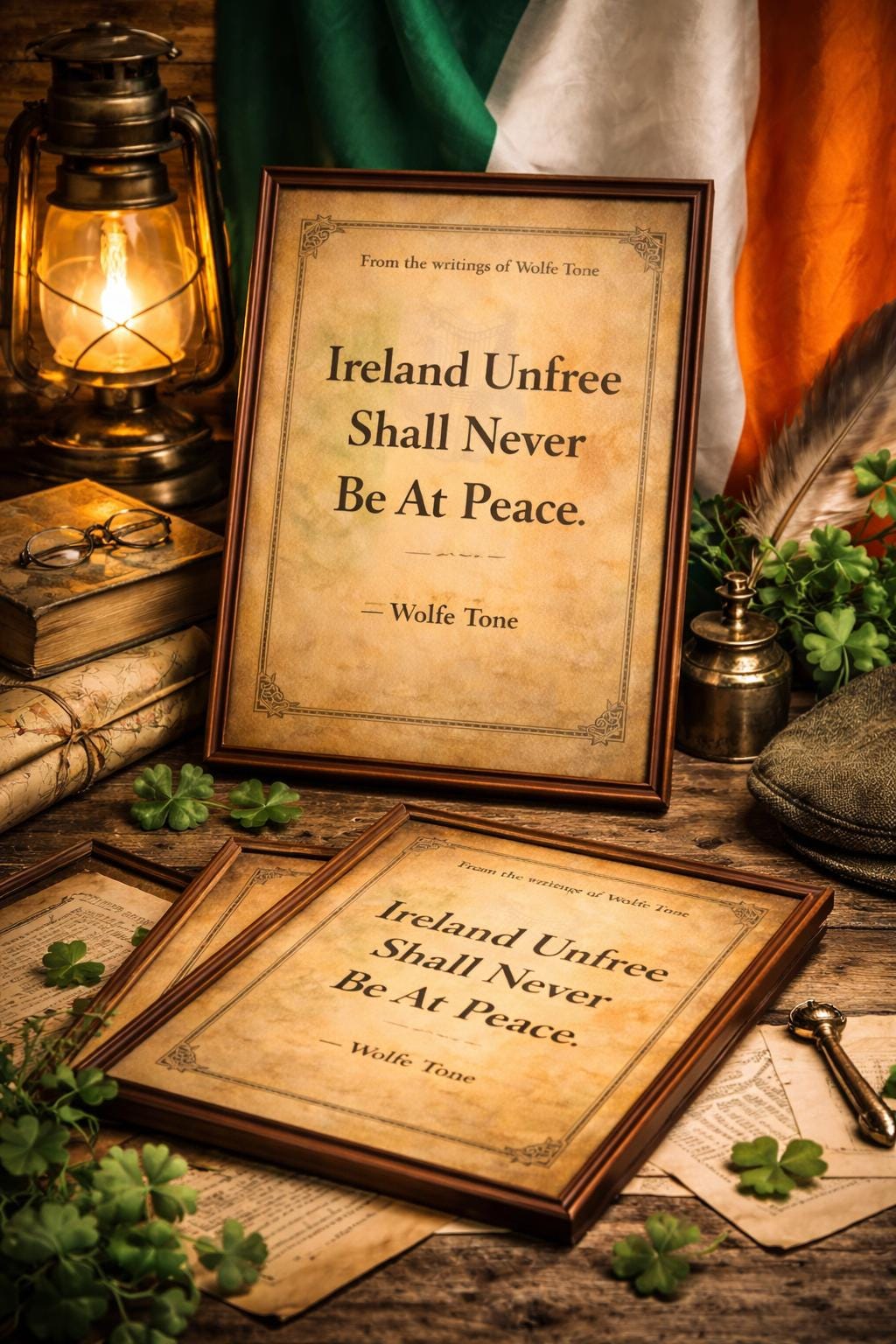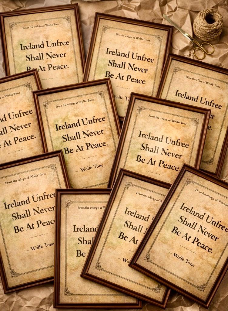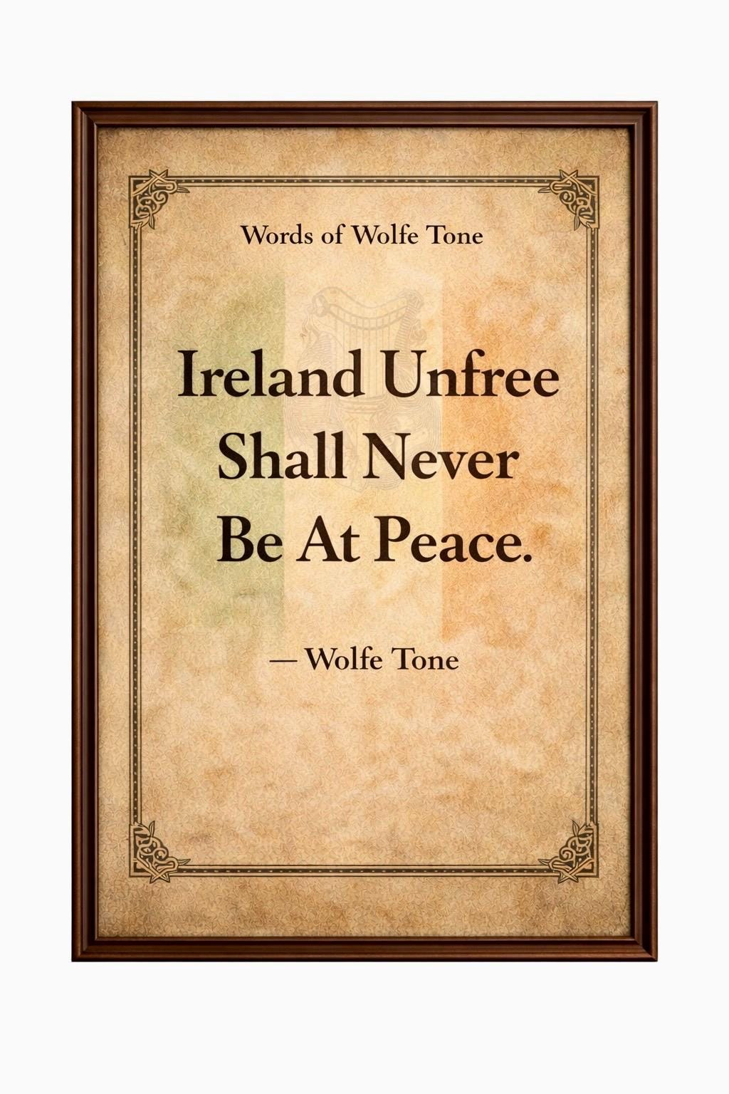 This framed Irish history print features the famous Wolfe Tone quote presented in a vintage parchment style, inspired by historic Irish documents and revolutionary writings.