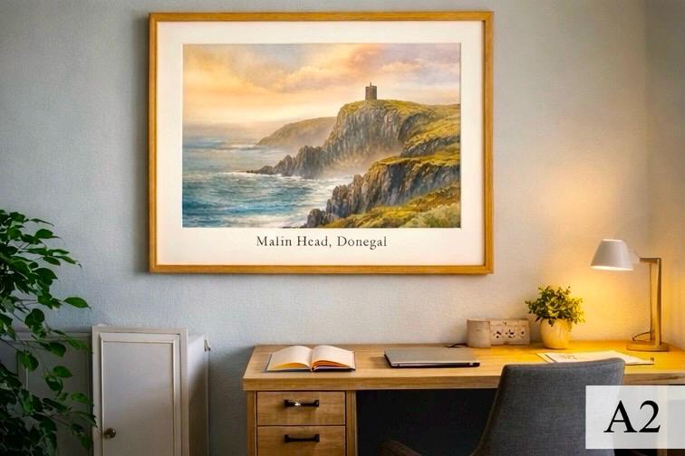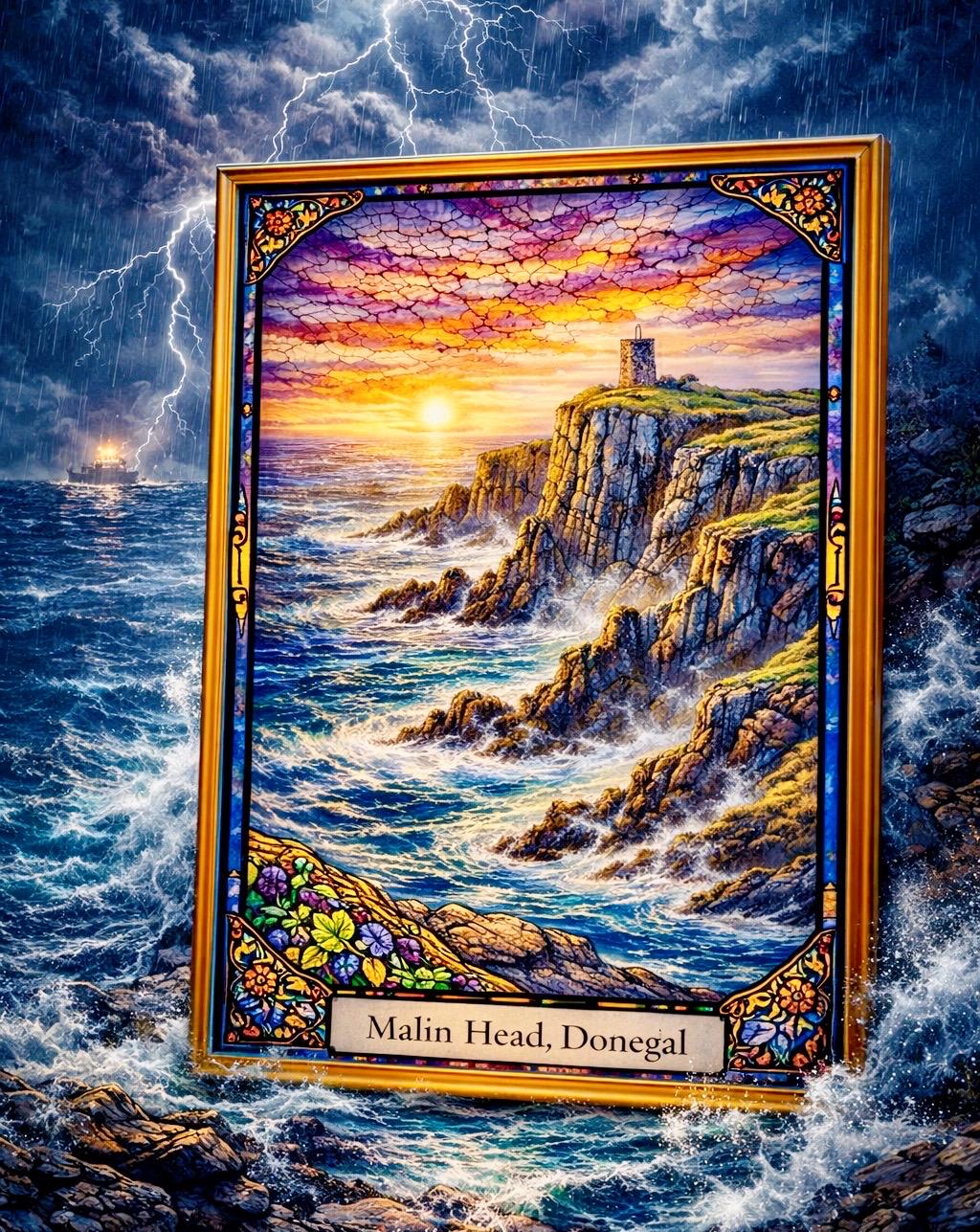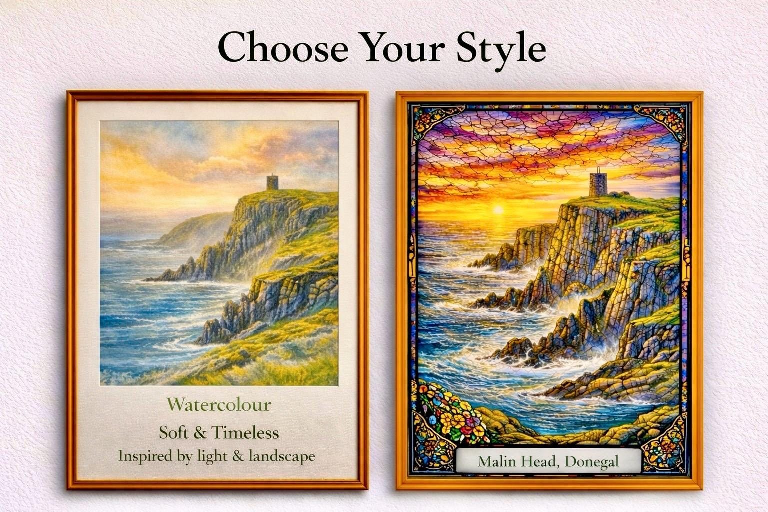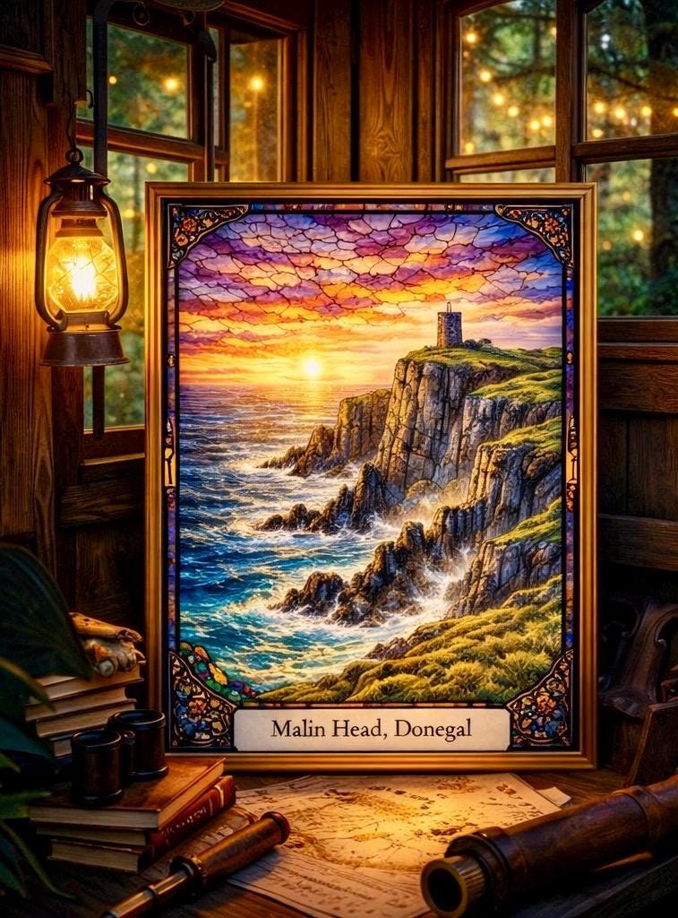 Each piece is a stylised artistic rendering inspired by Malin Head, Donegal, created to capture the mood, light, and spirit of the Wild Atlantic Way.