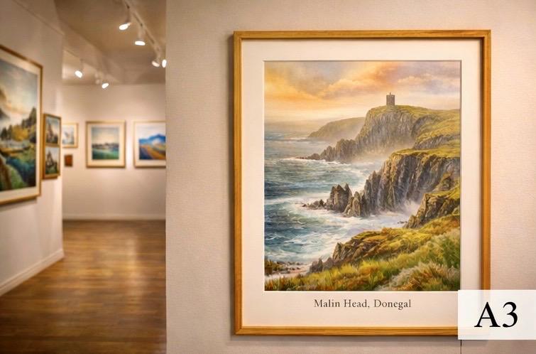 This piece captures the wild beauty of Malin Head, with windswept cliffs, rolling waves, and golden light stretching across the horizon. A place that feels untouched, elemental, and deeply connected to Ireland’s spirit.