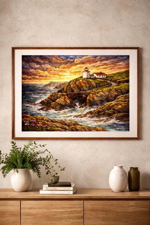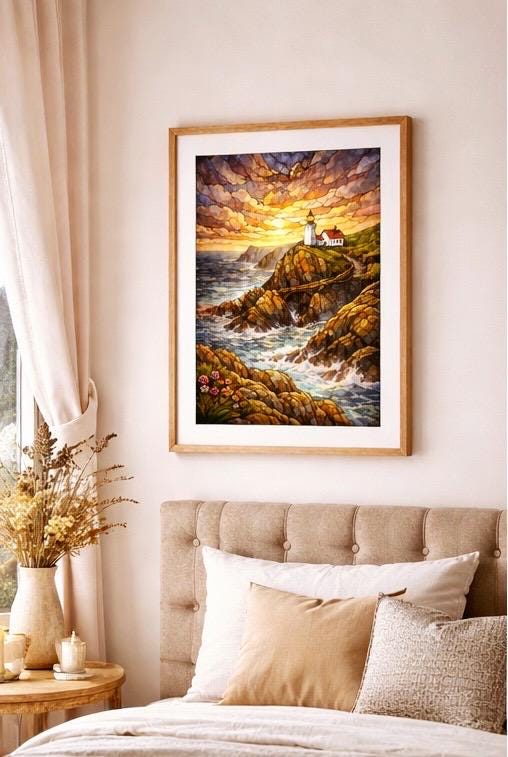 Mizen Head print inspired by Ireland’s Wild Atlantic Way, available in a soft watercolour or rich stained glass style.