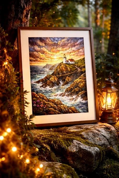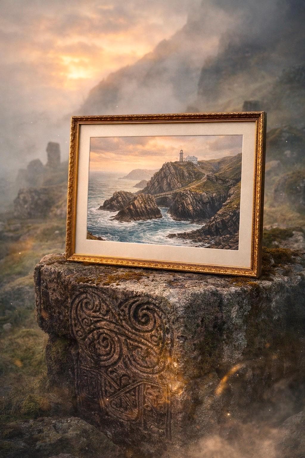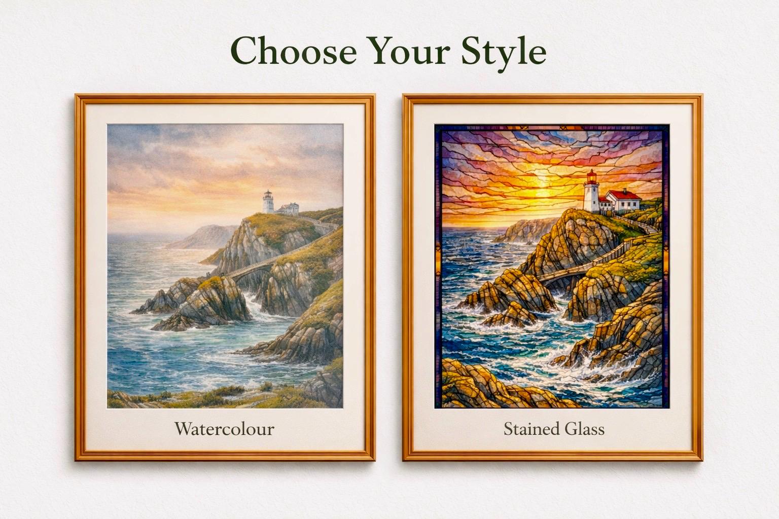 These artworks are digitally created interpretations of Mizen Head, inspired by the Wild Atlantic Way. Each style captures the mood and spirit of the landscape rather than a specific photograph.