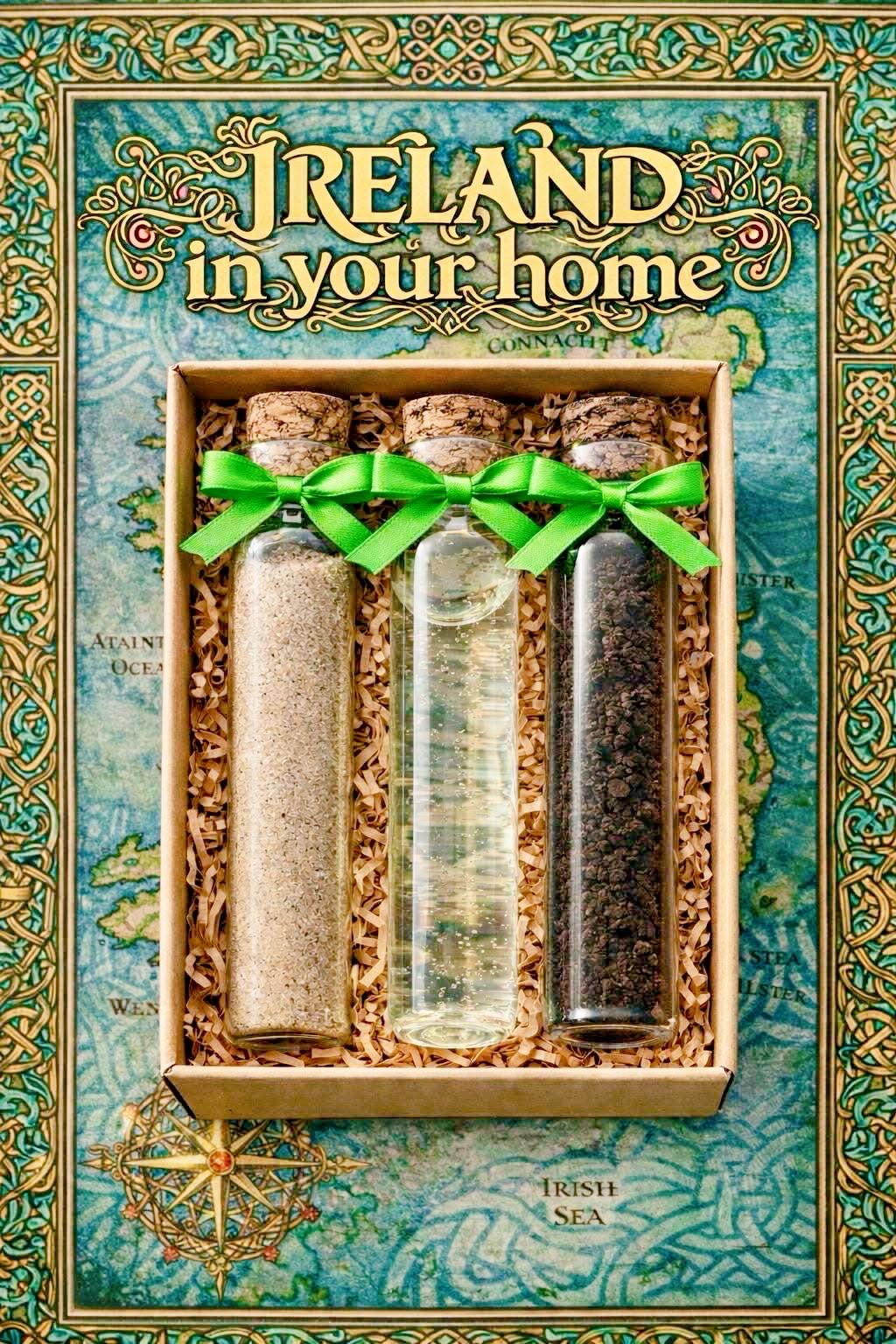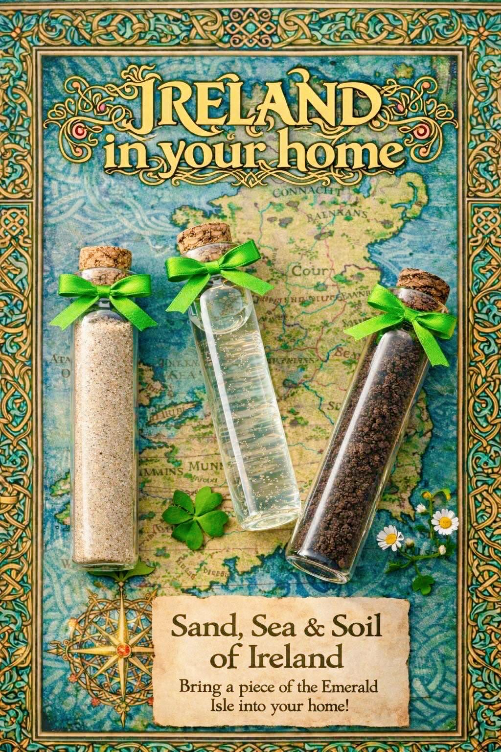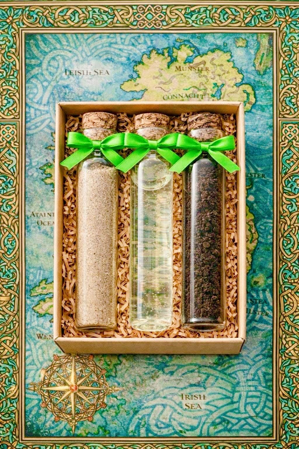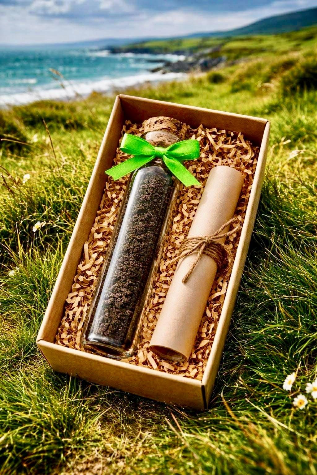 This unique handcrafted Irish keepsake collection captures the very essence of the Emerald Isle — its land, its coast, and its flowing waters — carefully gathered and preserved in elegant glass corked vials.
