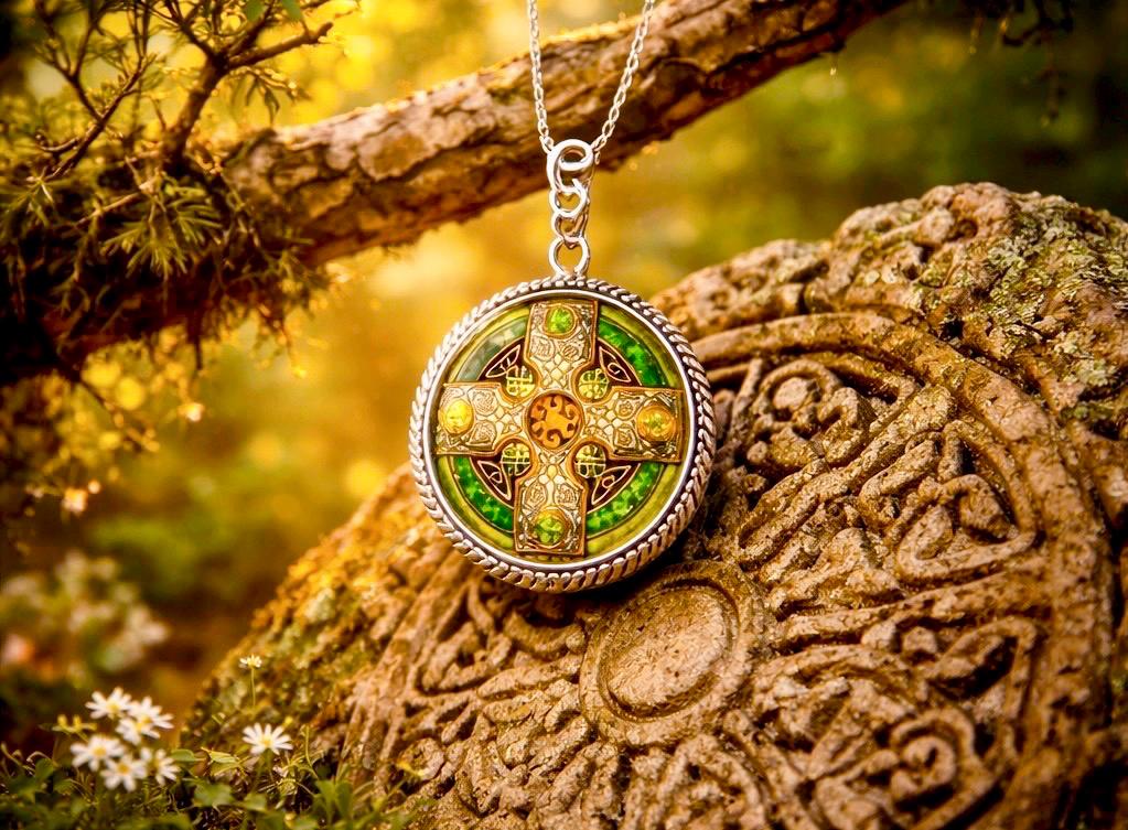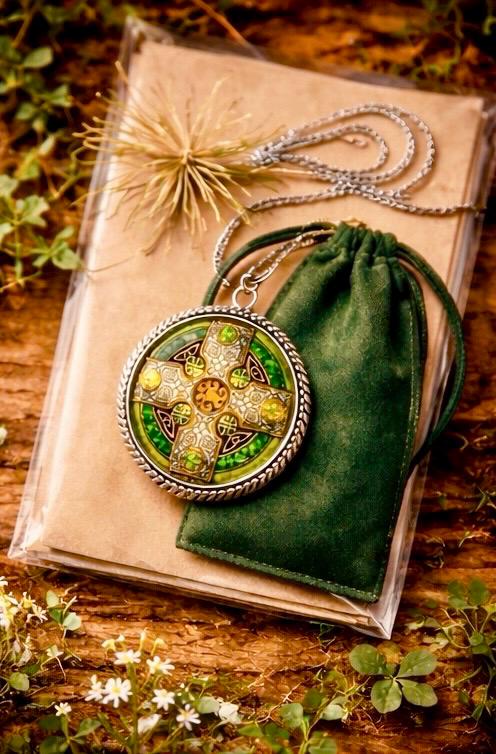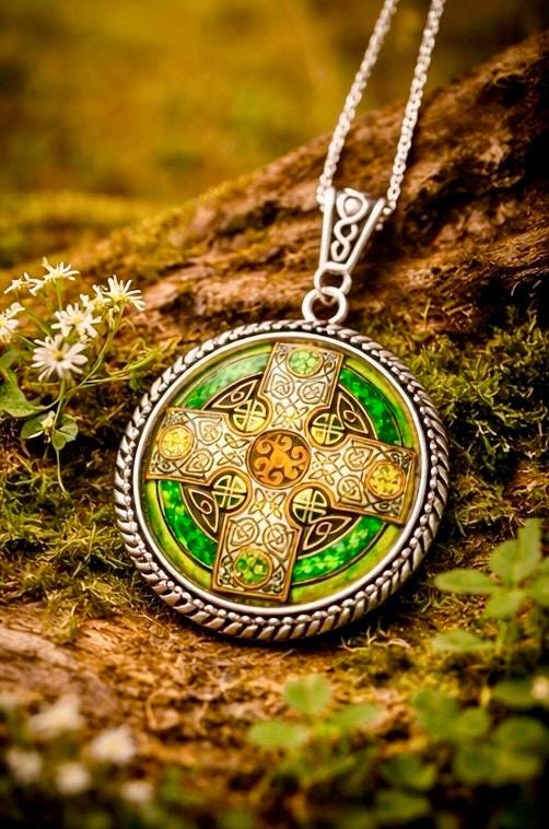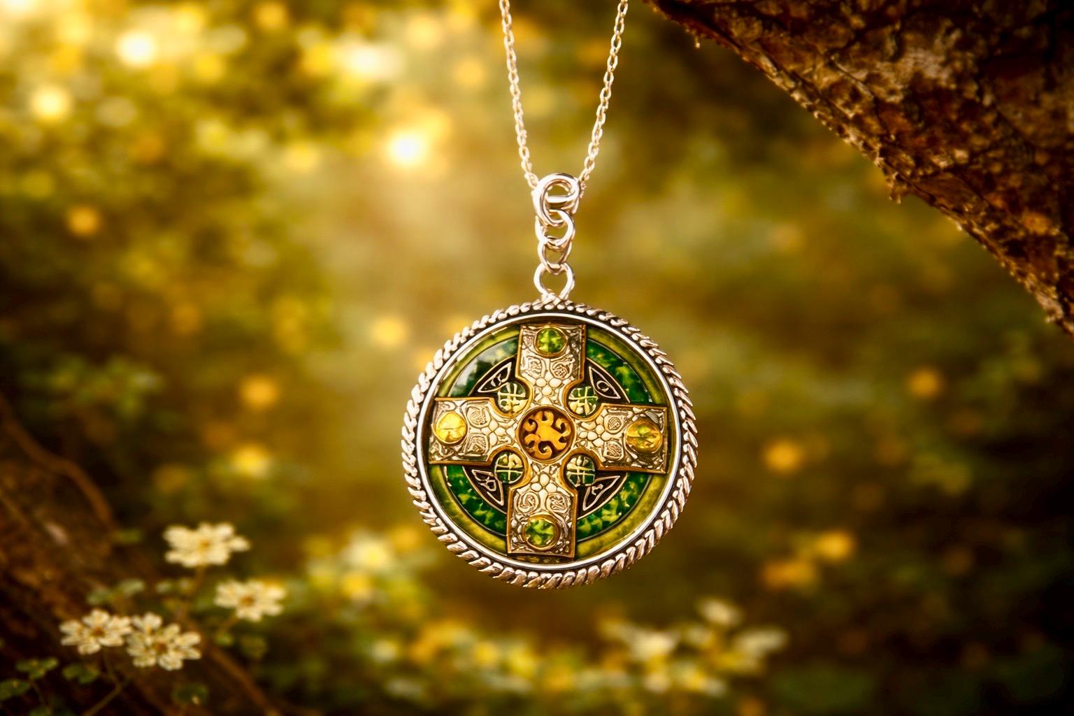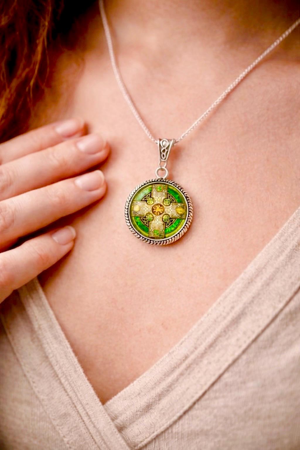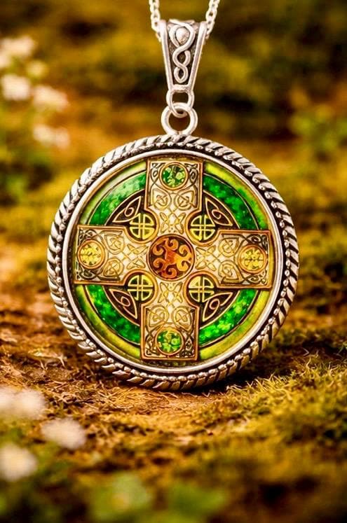 The detailed cross design reflects ancient Celtic craftsmanship, while the vibrant emerald tones catch the light, giving the pendant a subtle glow with every movement.