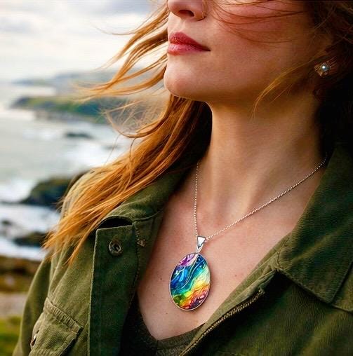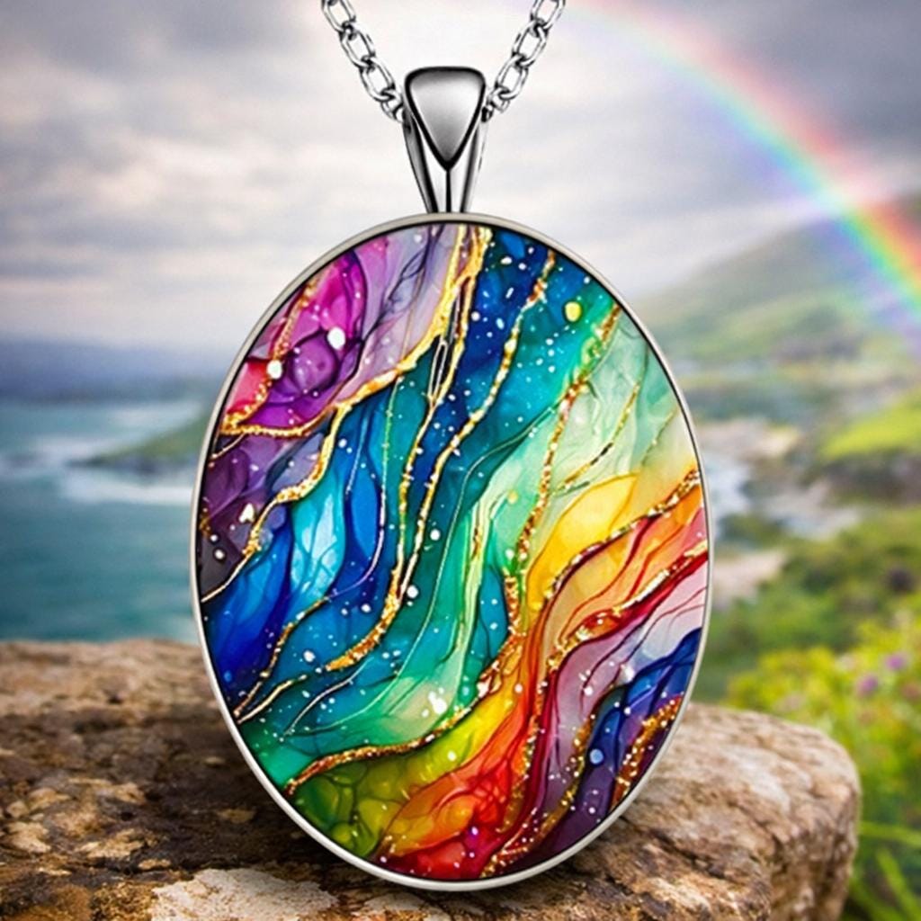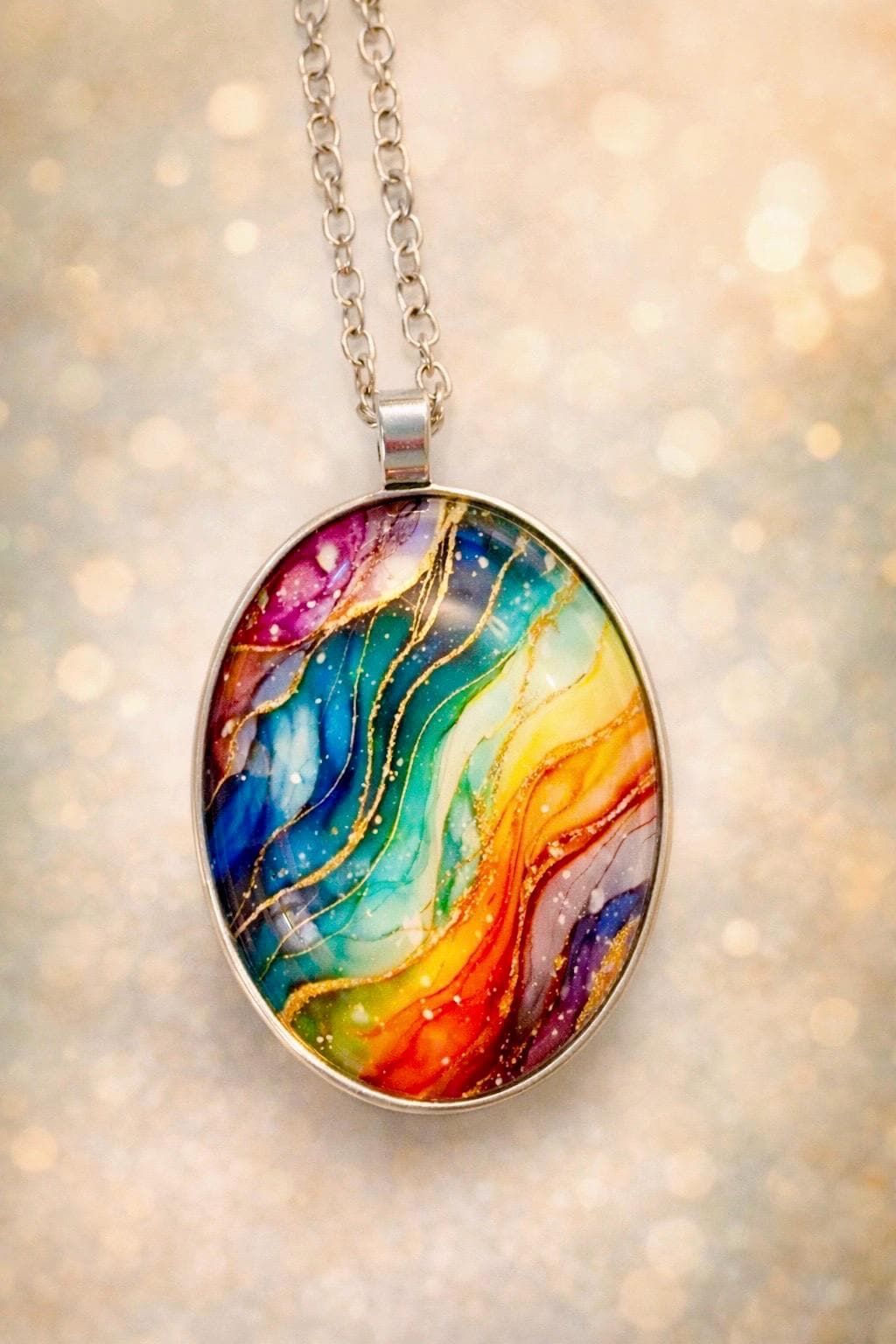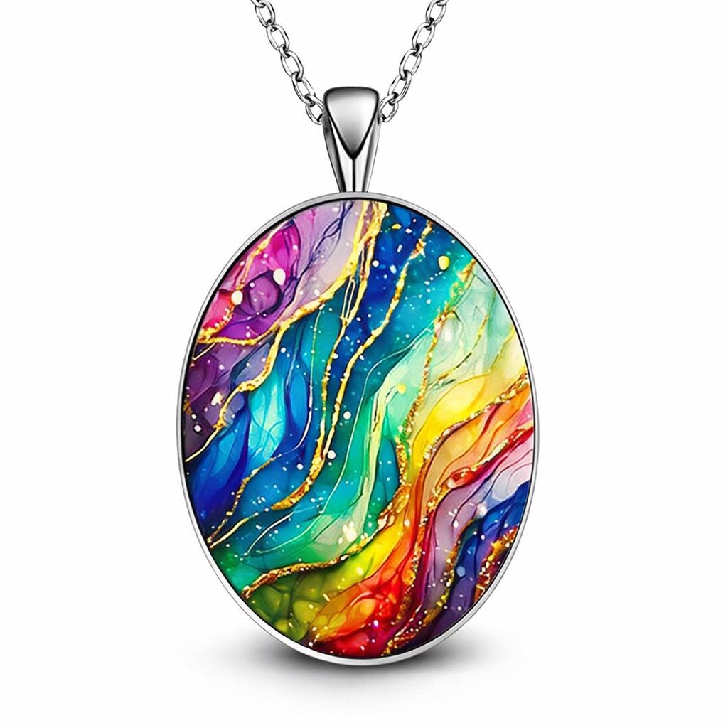 • Pendant: Glass cabochon with marble-style rainbow design