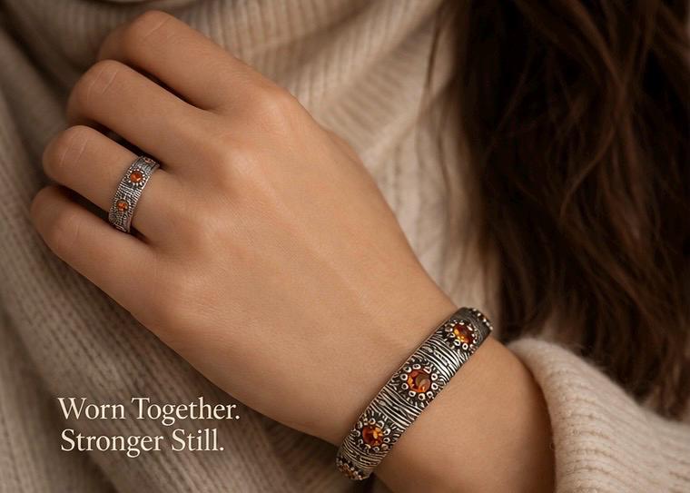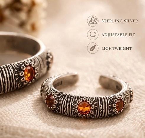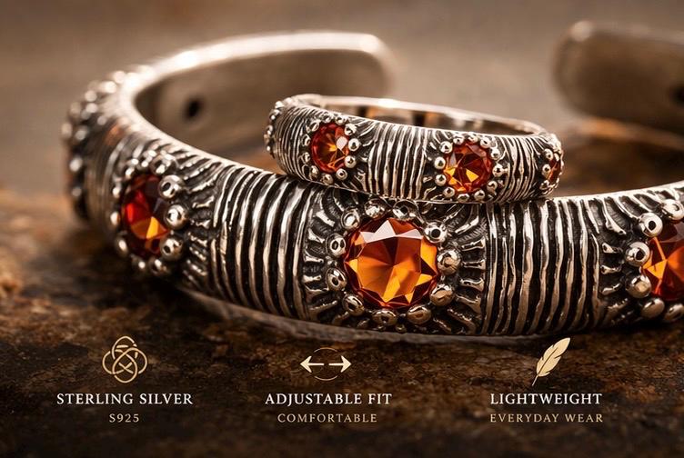 Each piece is crafted in sterling silver, with warm amber-toned stones that catch the light like embers — subtle, but alive.