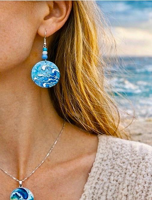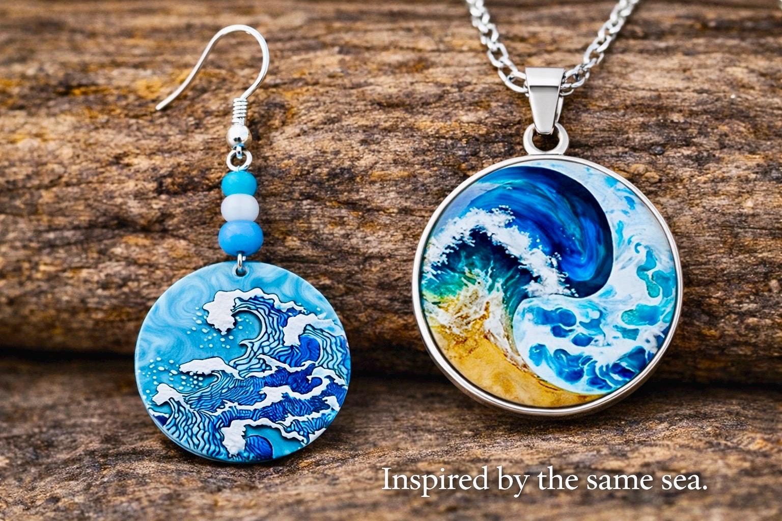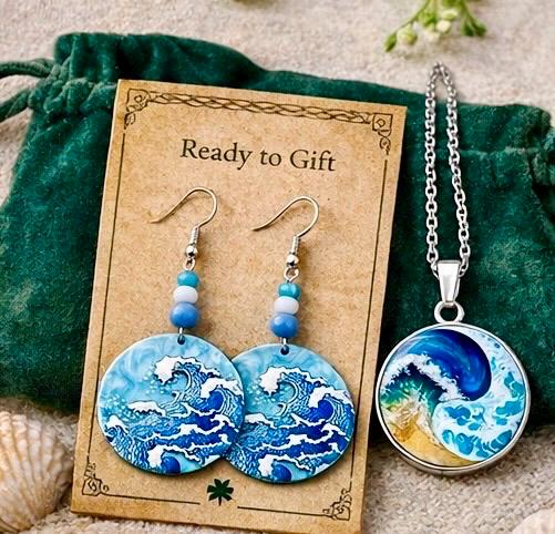 The earrings reflect the rhythm and movement of the waves, while the pendant captures a single moment — a wave suspended in time.