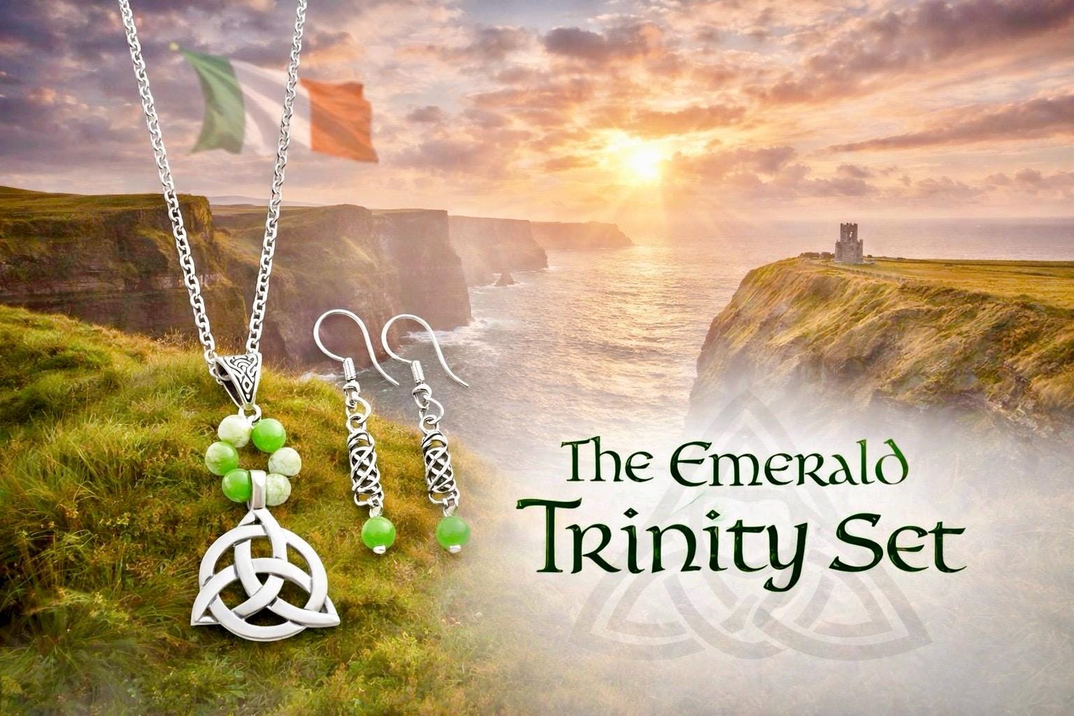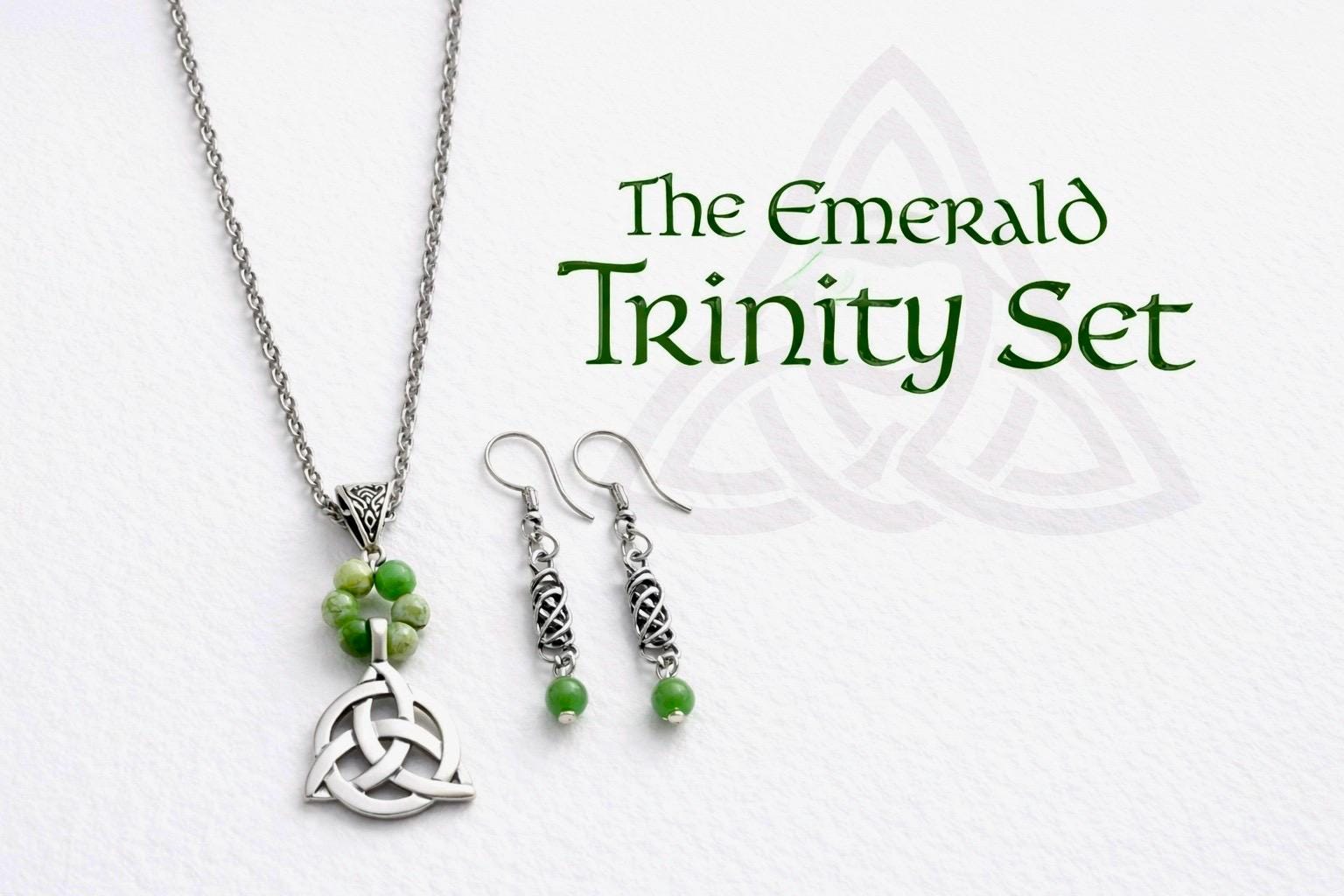 Inspired by Ireland’s ancient symbols and the deep green tones of the land itself, The Emerald Trinity Set brings together tradition, meaning, and natural beauty in one striking design.