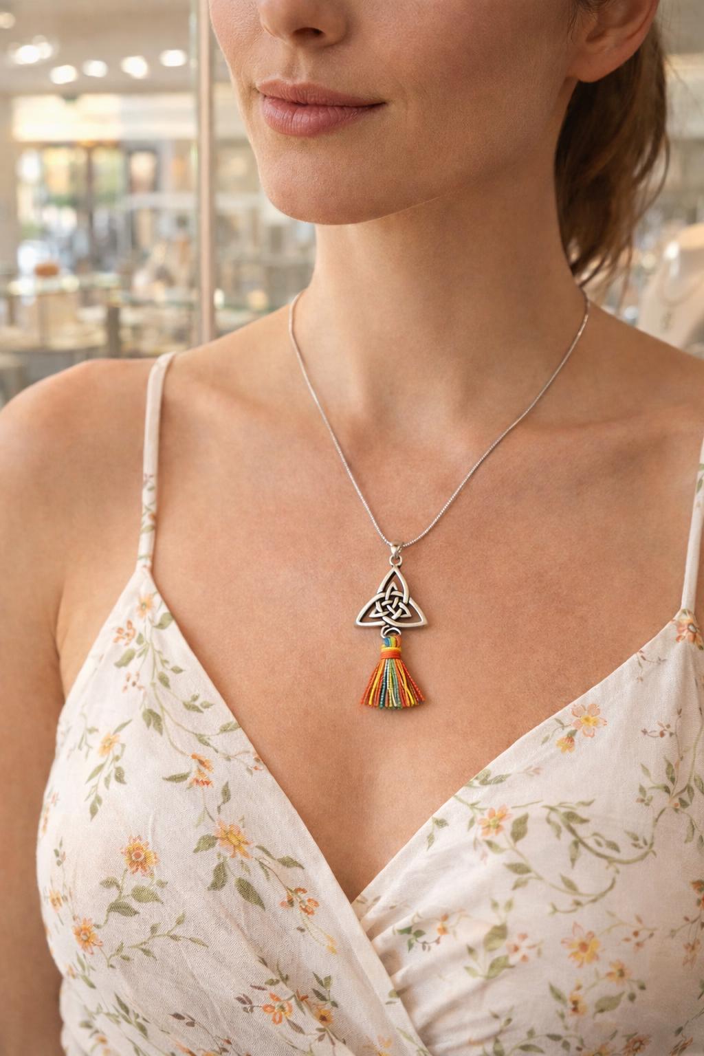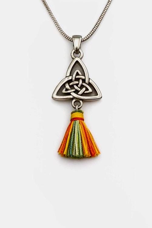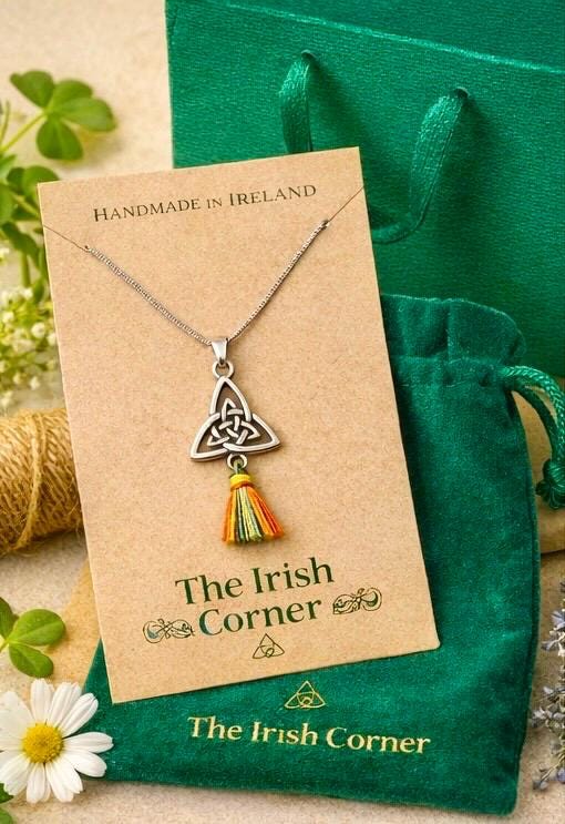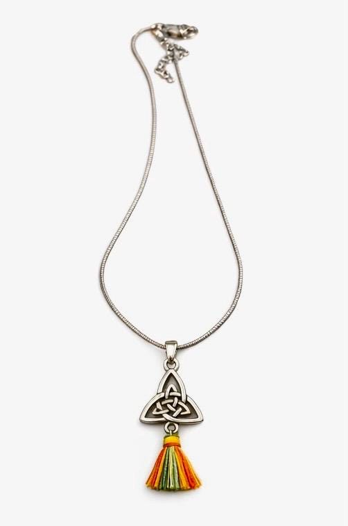 At its centre sits the timeless Celtic Trinity Knot — a symbol of connection, eternity, and the unbroken threads that tie us to our past, our people, and the moments that matter most. Beneath it, a vibrant tassel adds a soft, playful touch of colour, catching the light with every movement.