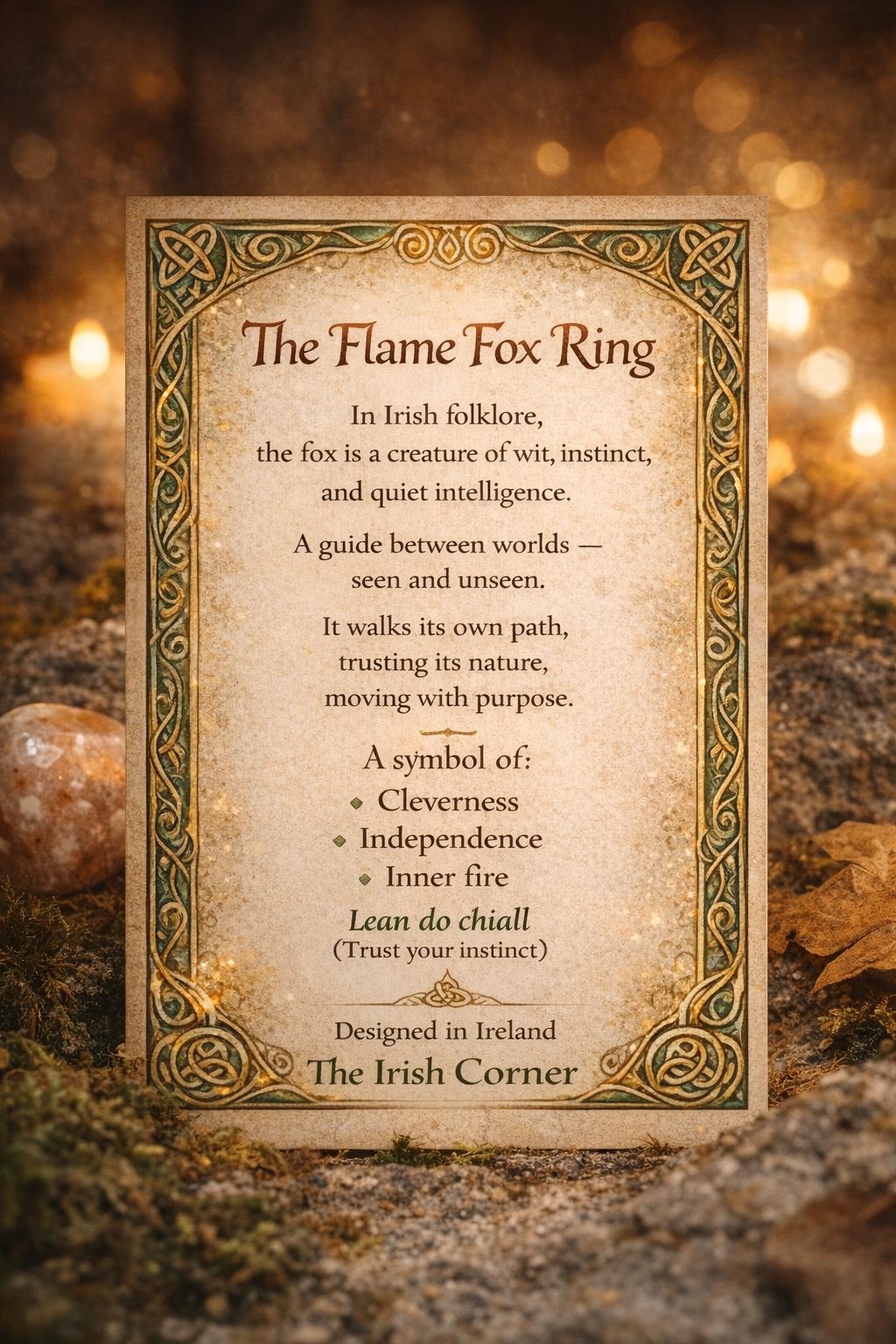 The Flame Fox Ring is a delicate, finely detailed piece designed for those who walk their own path. In Irish tradition, the fox (an sionnach) is a creature of awareness and quiet intelligence — a guide between worlds, seen and unseen.
