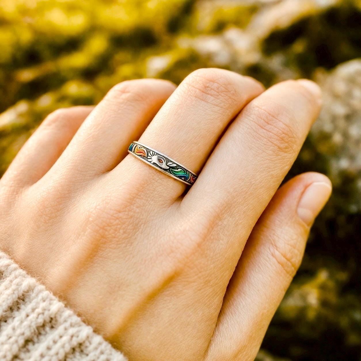 The ring echoes it — a subtle flame winding its way around a delicate band.