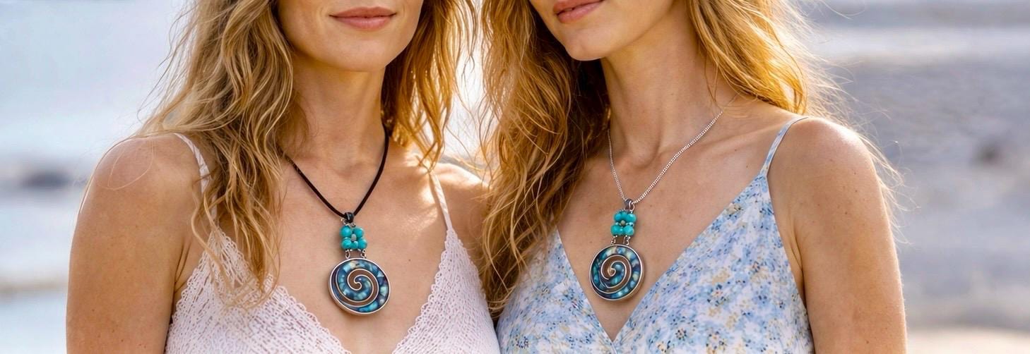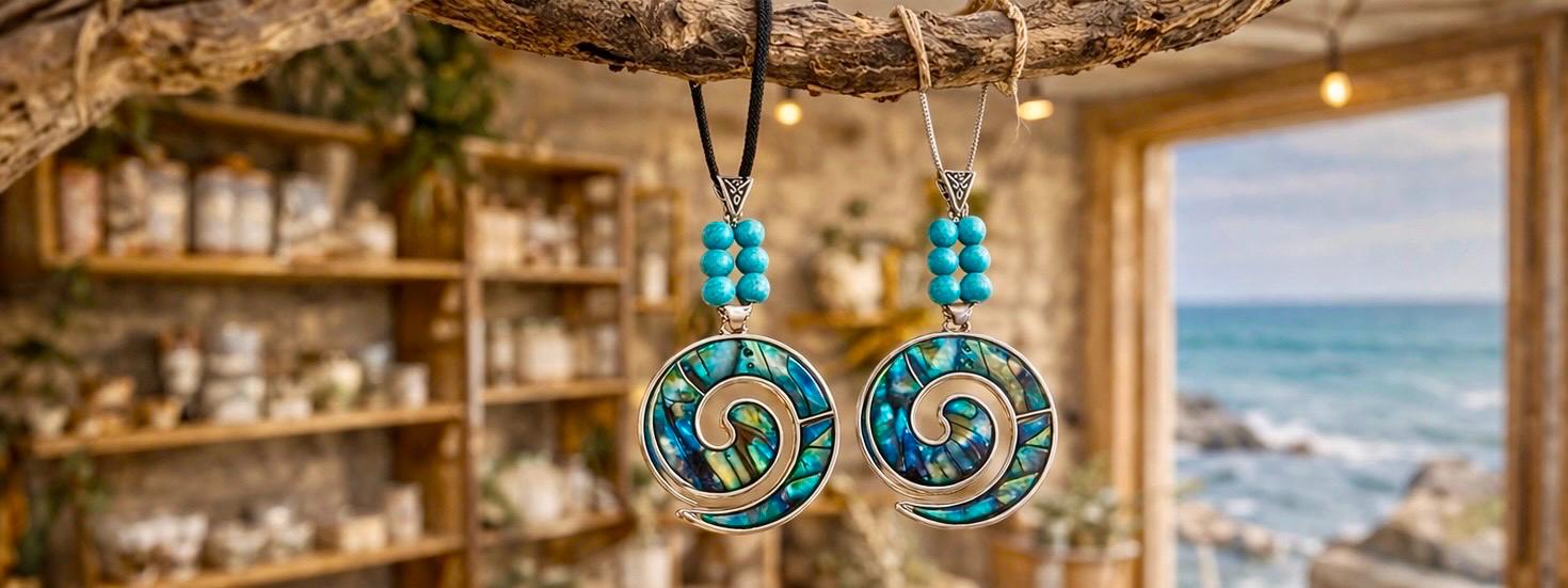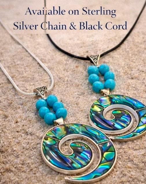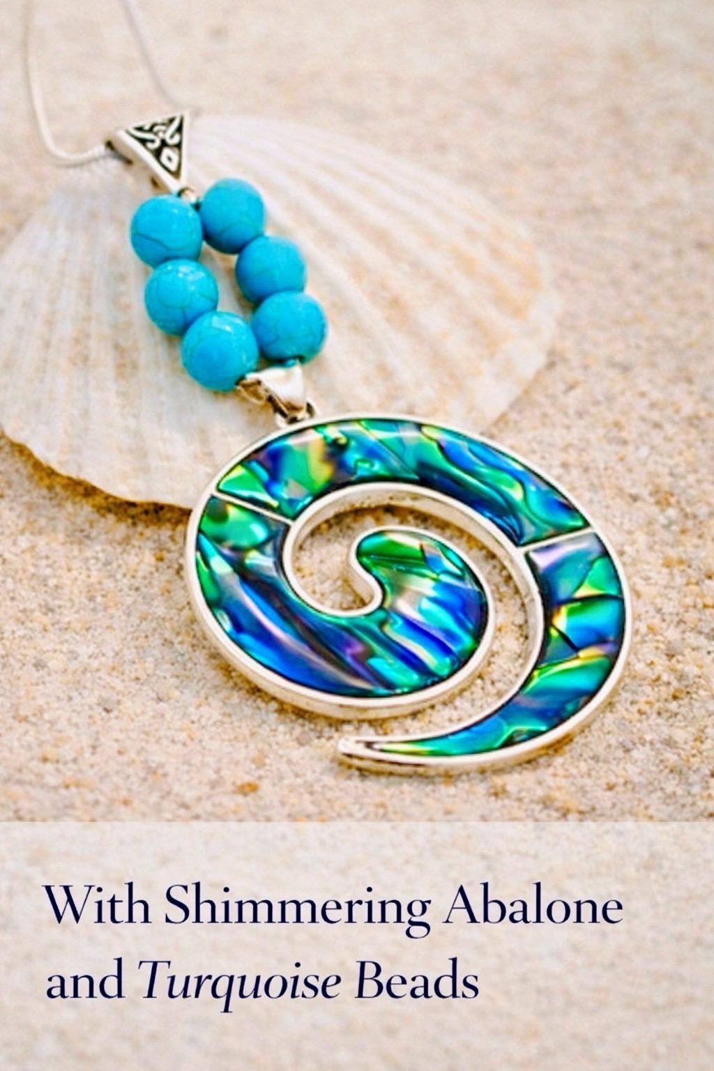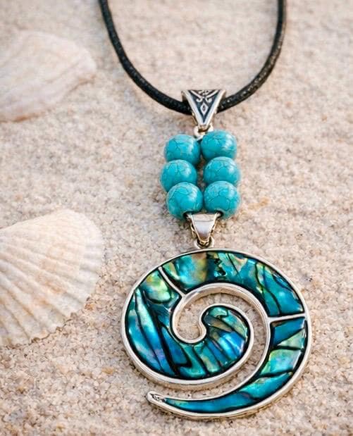 Inspired by the ever-changing colours of the sea, this striking spiral pendant is crafted from shimmering abalone shell — each piece reflecting deep blues, greens, and flashes of ocean light.