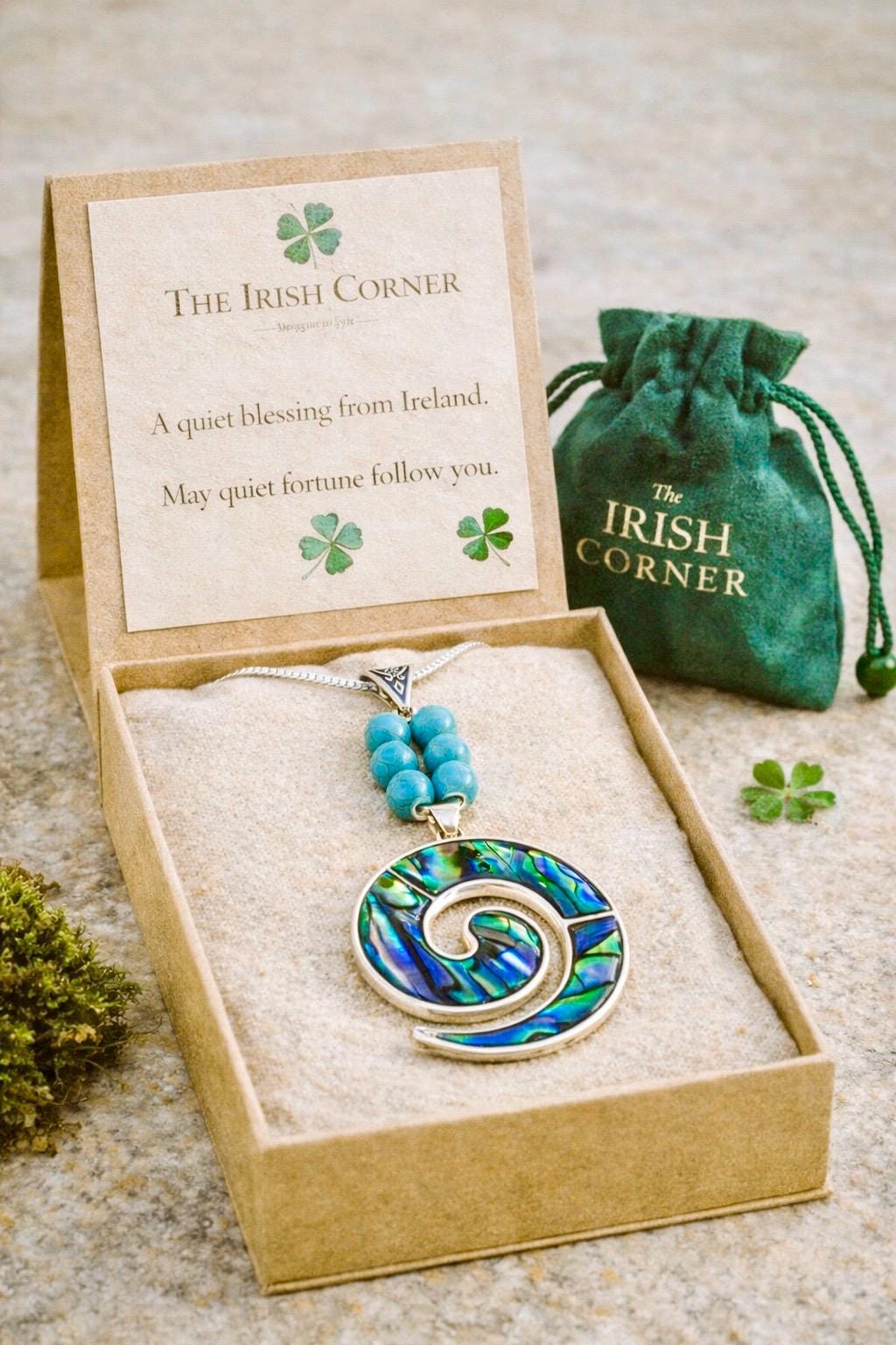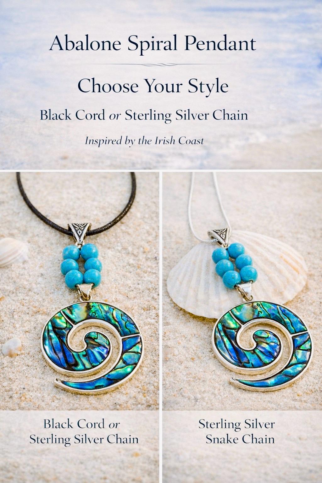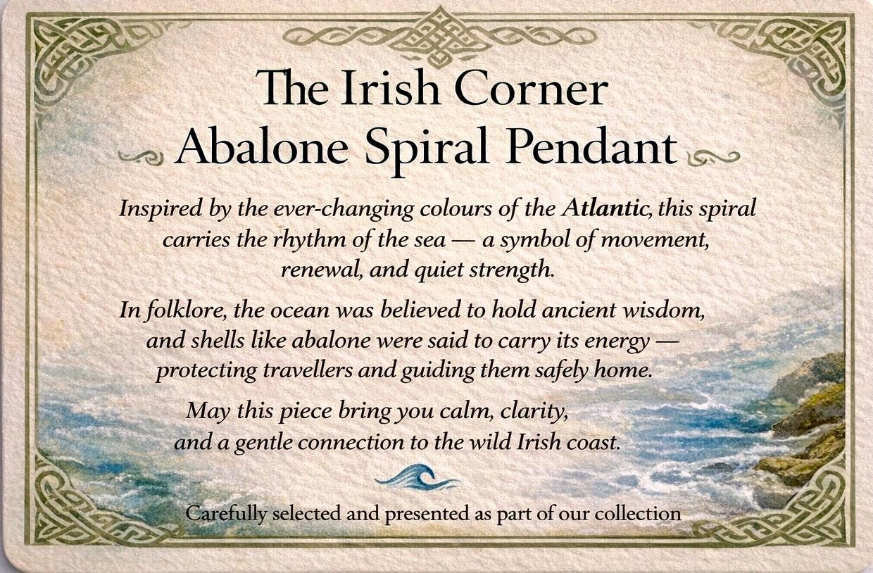 Inspired by the rhythm of the Atlantic, this abalone spiral pendant captures the light, movement, and magic of the Irish coast.