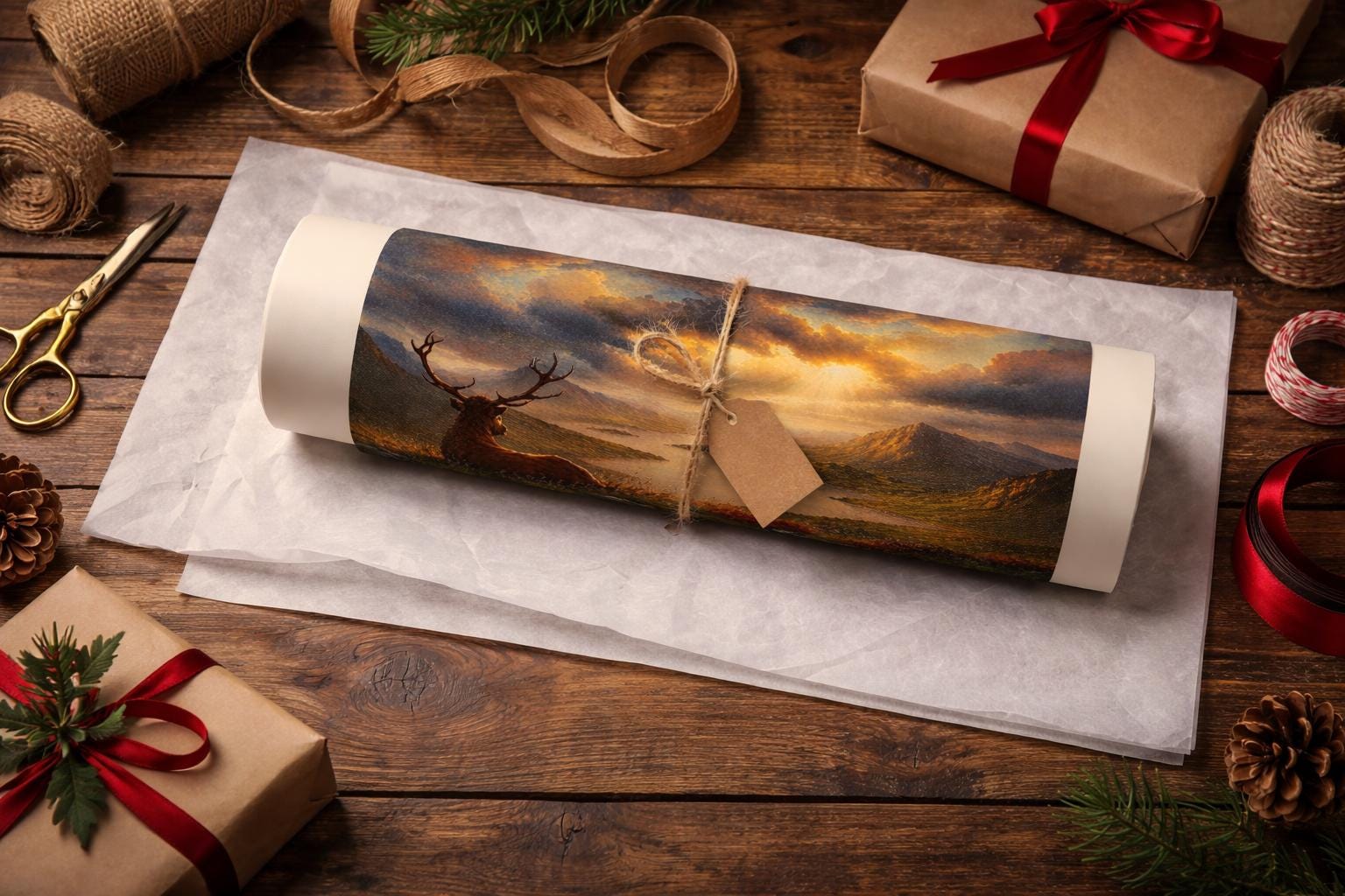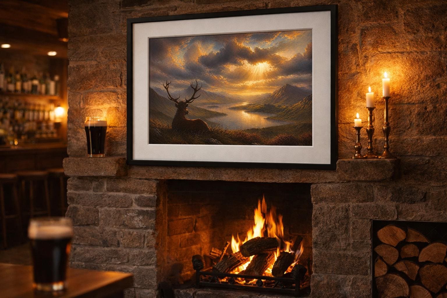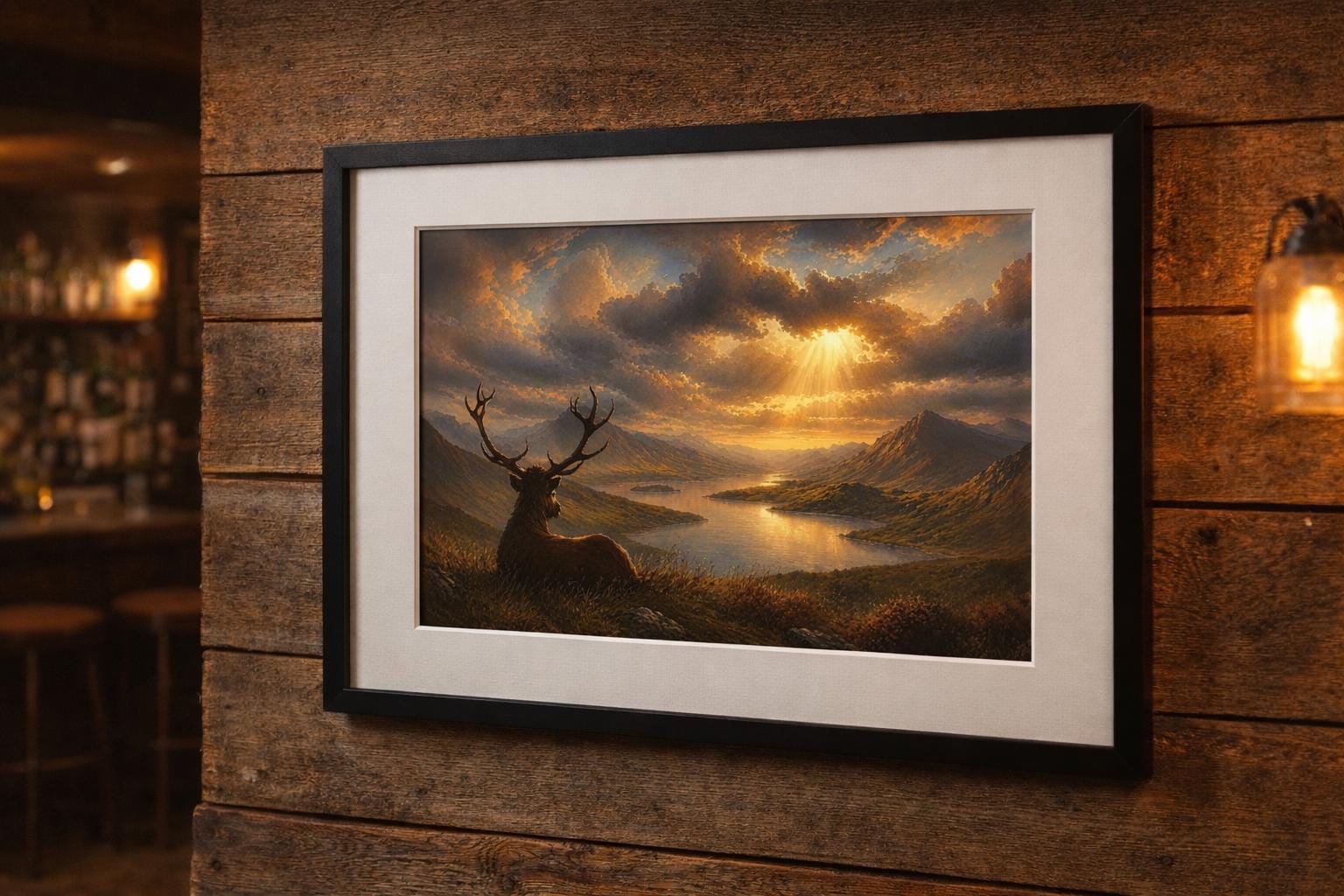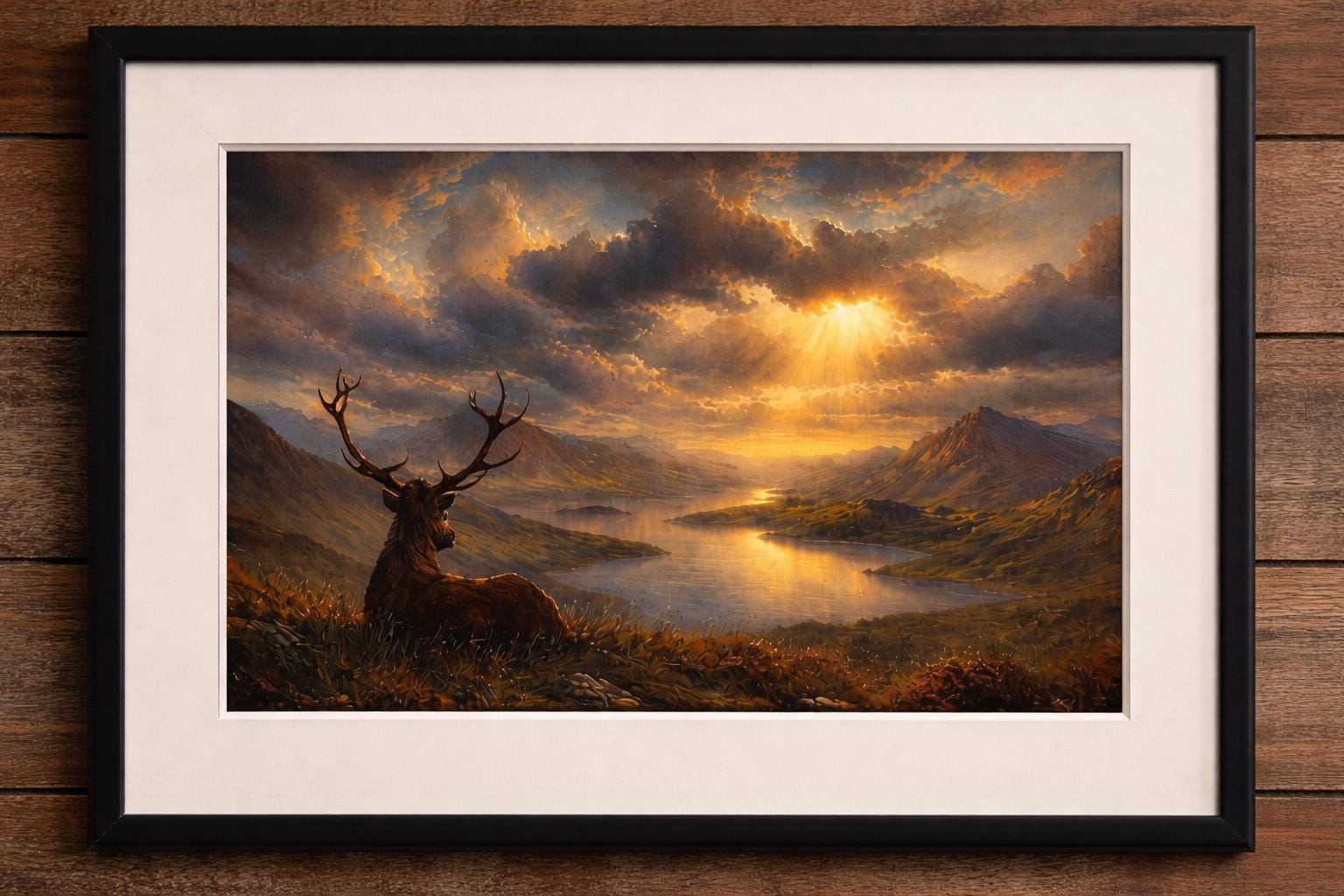 Bring the wild beauty of Ireland into your home with this striking DeBurca Art piece, capturing a powerful stag overlooking a glowing valley at sunset. Bathed in golden light breaking through dramatic skies, this artwork blends strength, peace, and timeless Irish spirit.