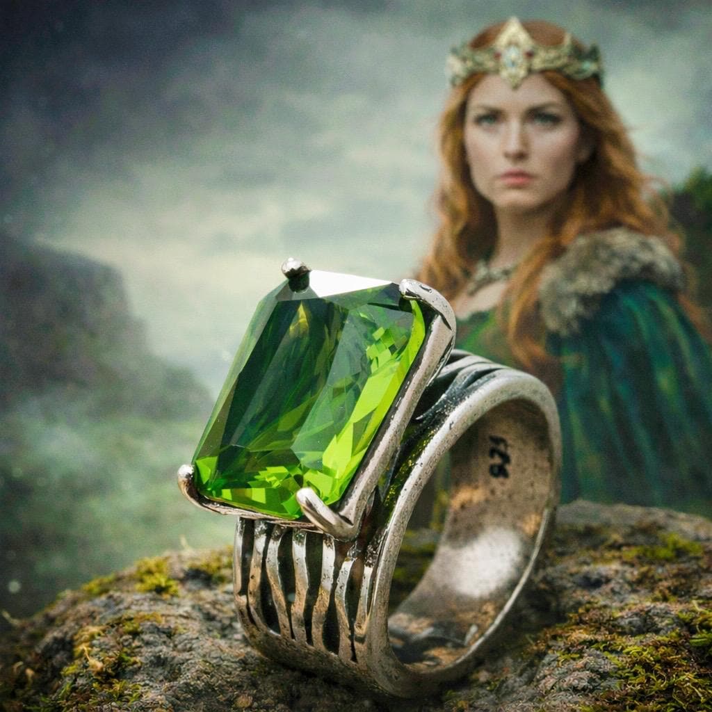 At its heart sits a striking emerald-green stone, reflecting the richness of the Irish land itself — wild, enduring, and full of quiet strength. Set within a bold, sculpted band, this piece is designed to feel grounding, empowering, and deeply connected to something older than us all.