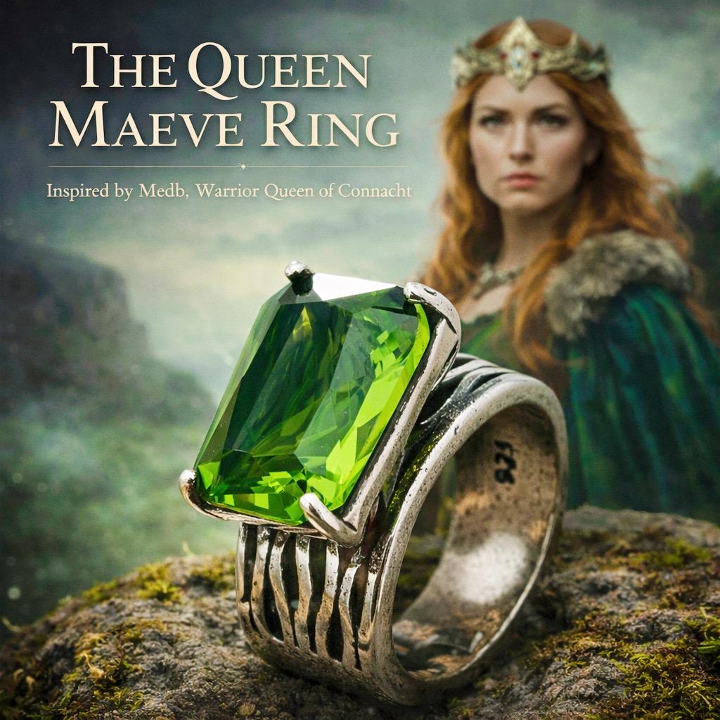 Commanding and unapologetically powerful, The Queen Maeve Ring draws its spirit from Medb, the legendary warrior queen of Connacht — a woman who ruled on her own terms and answered to no one.