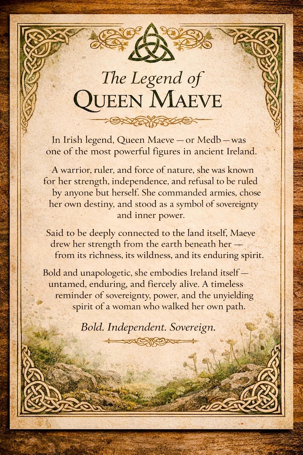 Inspired by Queen Maeve of Irish legend — a symbol of strength, sovereignty, and power.