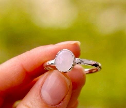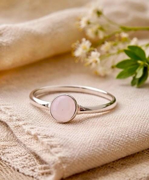 At its centre sits a pale blush gemstone, subtle and calming, catching the light in the most delicate way. Set in a simple sterling silver band, this piece is designed to feel effortless — something you can wear every day, yet still hold meaning.