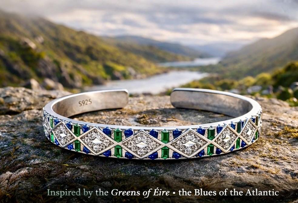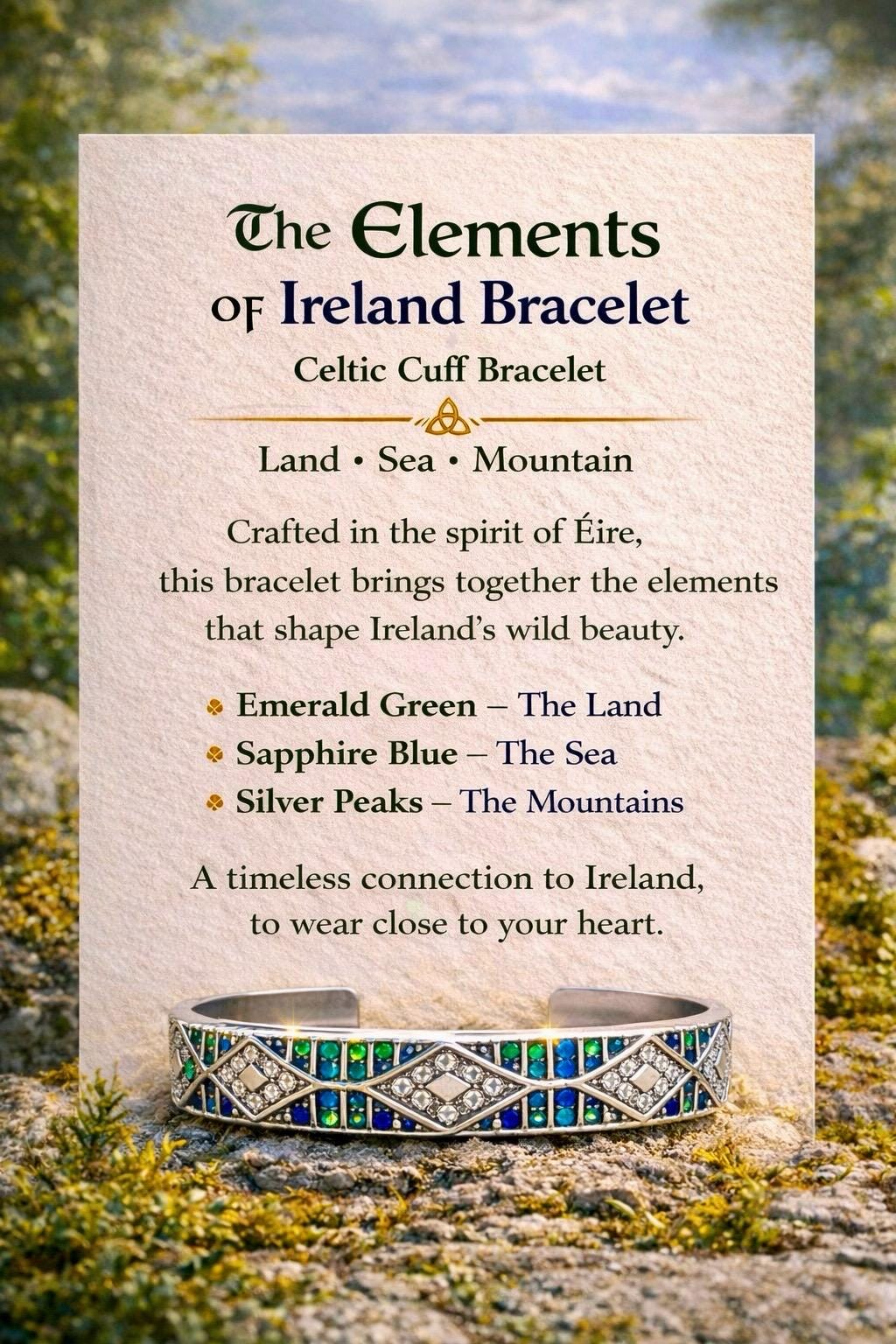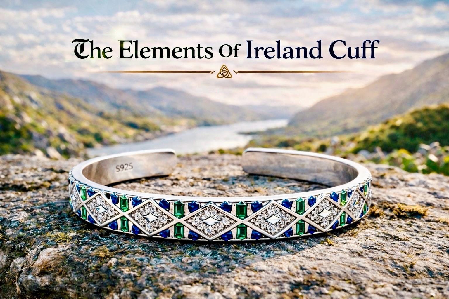 The Elements Of Ireland Cuff is a bold and beautifully detailed bracelet inspired by the natural elements that define Ireland — its rolling green landscapes, wild Atlantic waters, and enduring mountain peaks.
