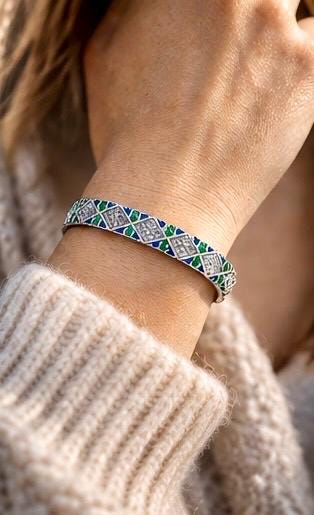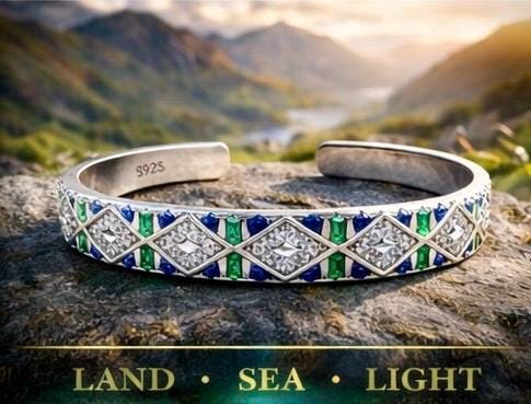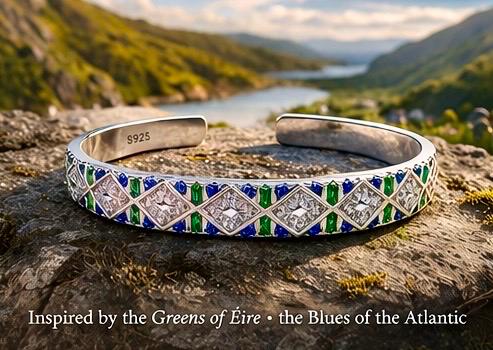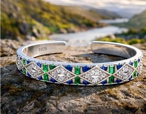 Crafted in sterling silver, this open cuff features a repeating diamond pattern symbolising the strength of Ireland’s mountains. Between each form, vibrant emerald tones reflect the rich green land, while deep sapphire blues echo the movement and depth of the Atlantic Ocean.