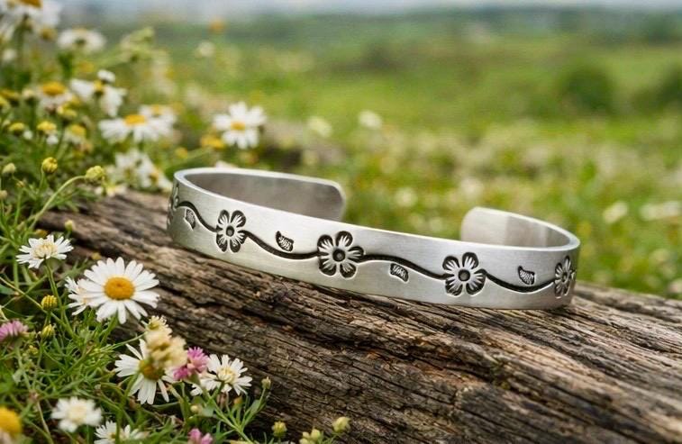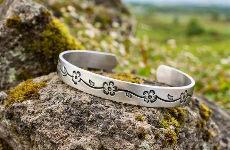 Each engraved flower flows gently along the bracelet like blossoms growing wild across the Irish countryside — natural, free, and full of life.