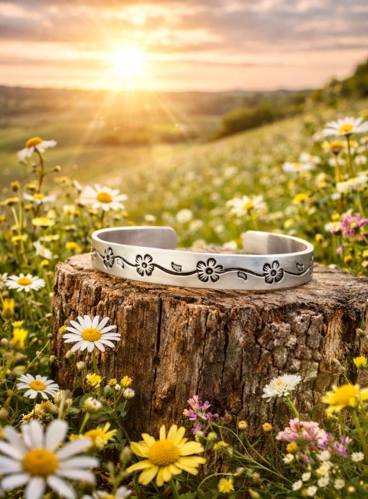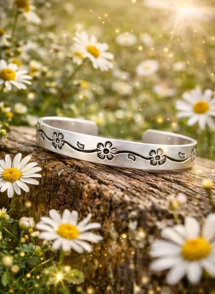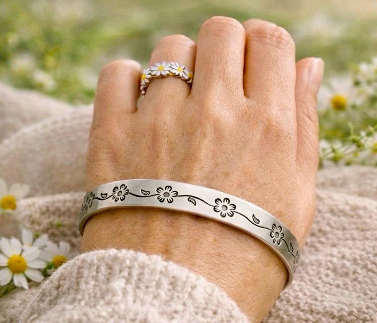 Inspired by the quiet beauty of Ireland’s wildflowers, this delicate floral cuff captures the essence of long summer days, soft breezes, and fields scattered with daisies.